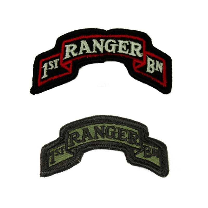 We offer a full line of US military shoulder patches. First Ranger Battalion shoulder scroll tab full color or subdued. New and original issue. Price is per each patch.