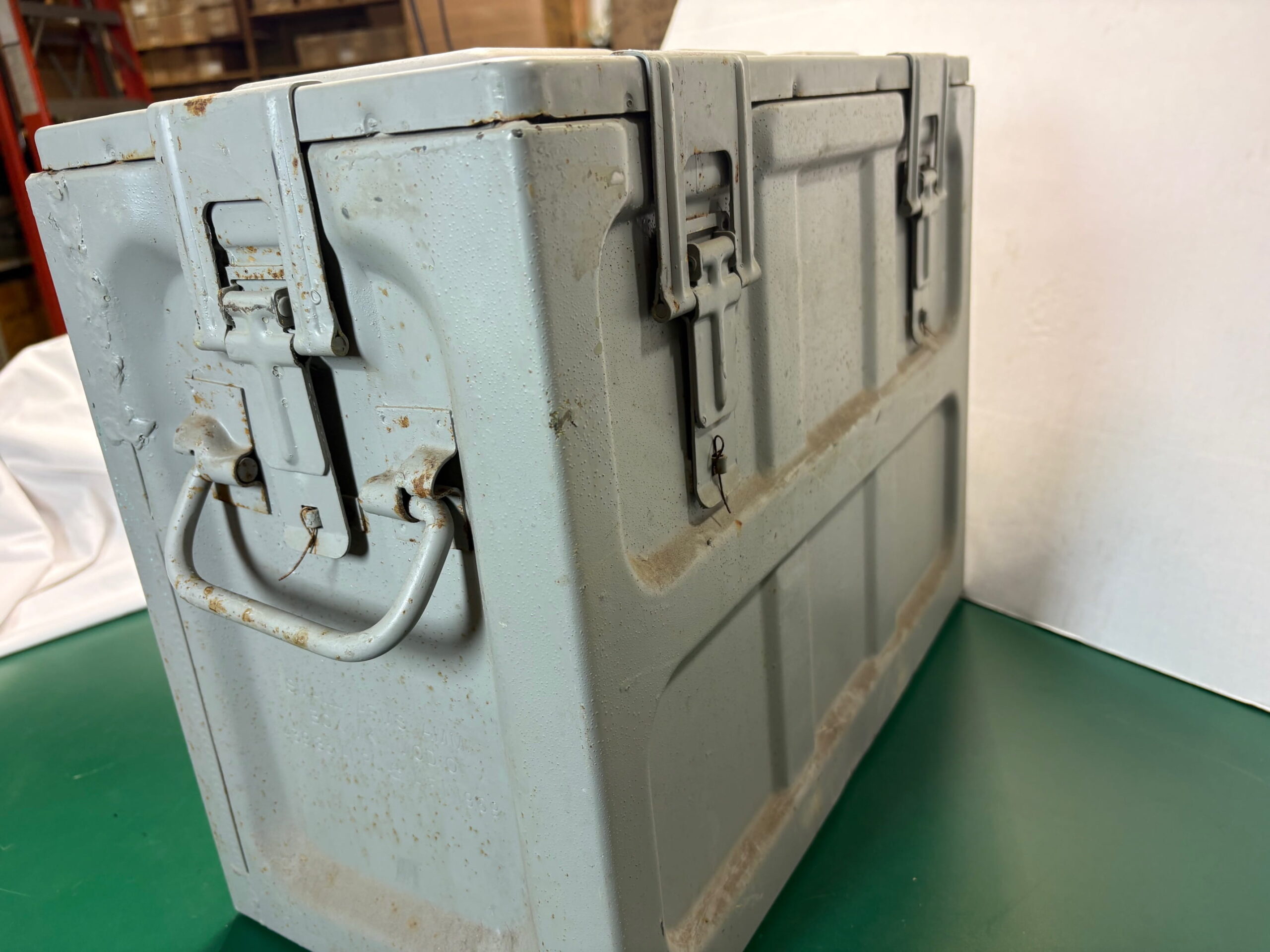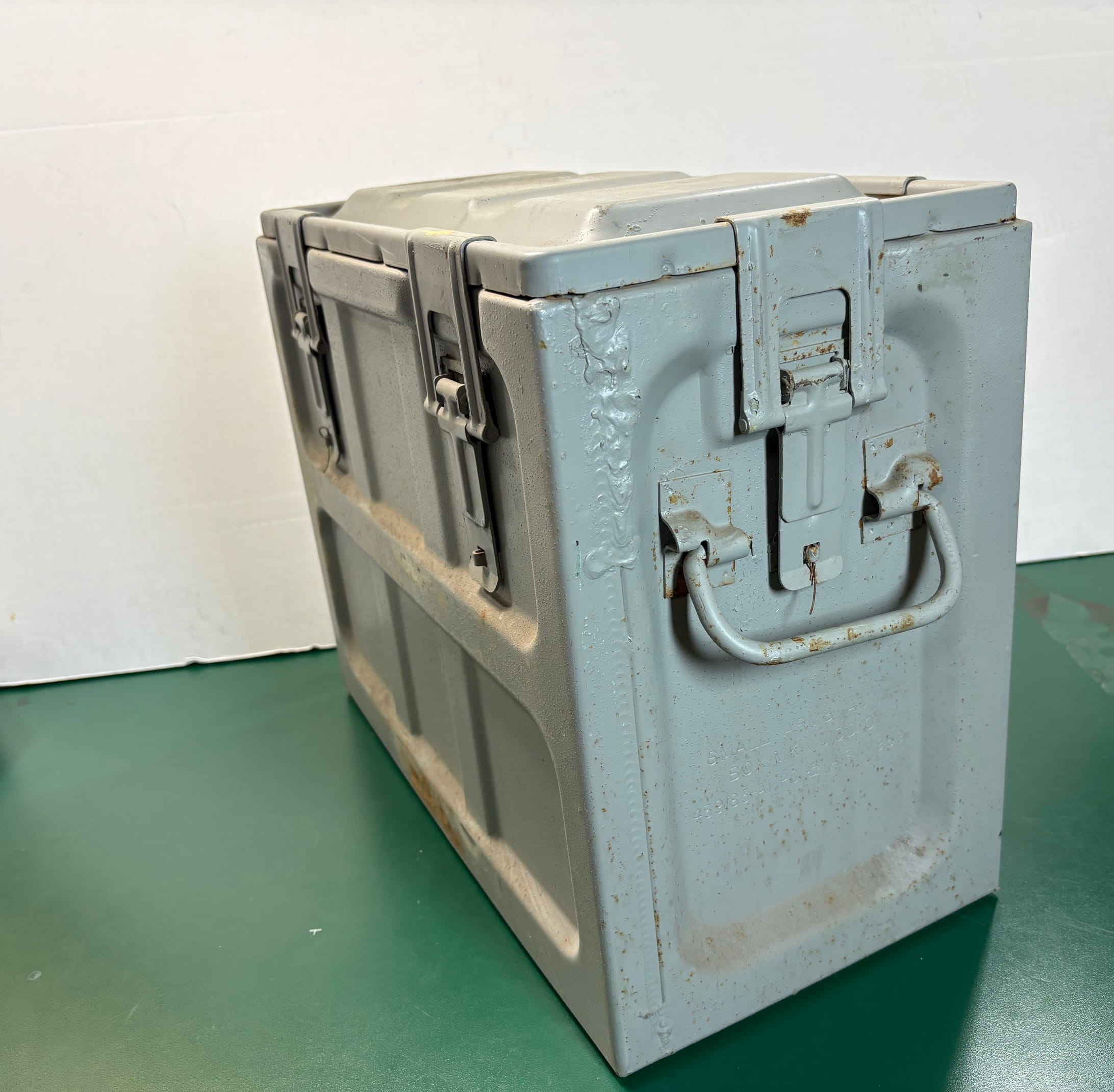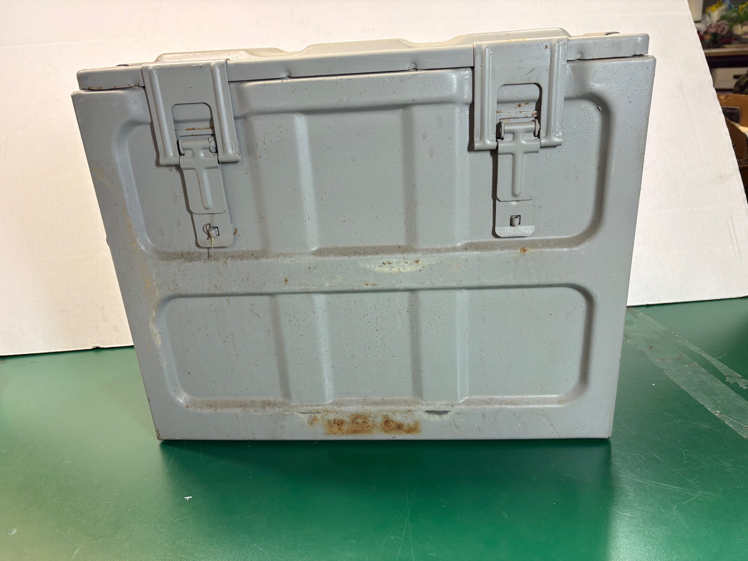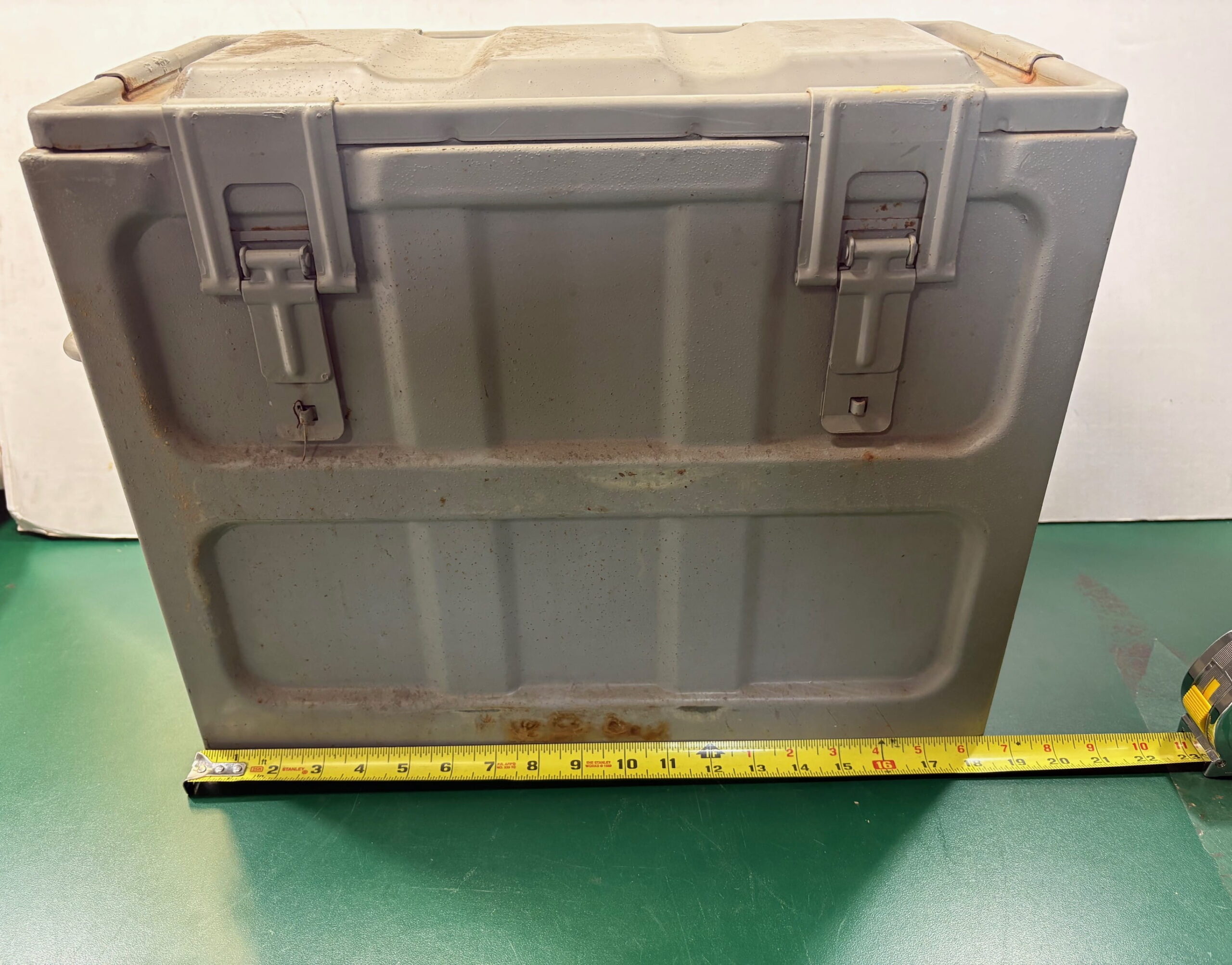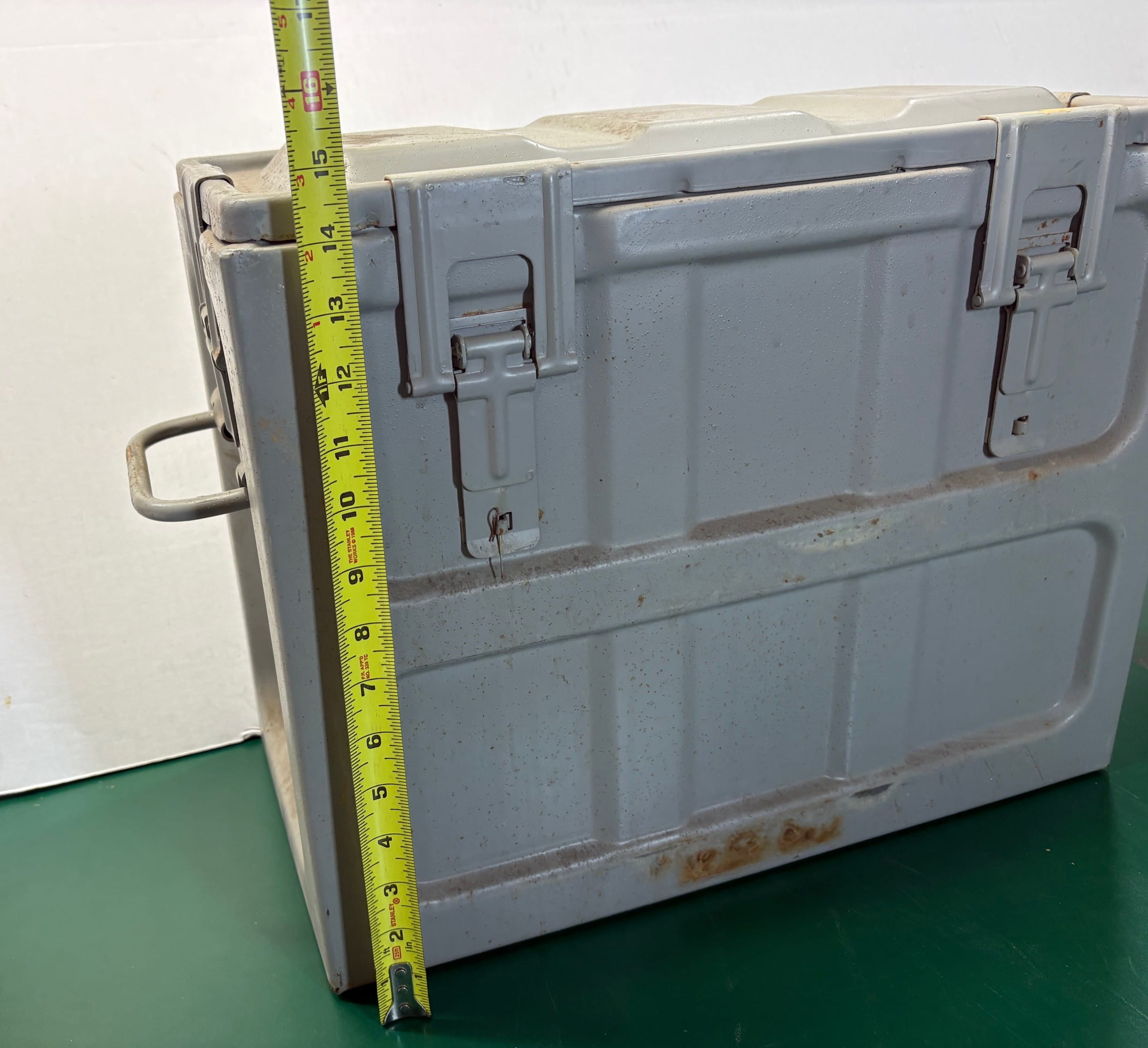 Steel 6 latch gray 20 mm ammo box. Removeable lid with live gaskets, double handle. Approx size 19 x 15 x 10. Used good condition with some storage wear and scuffs.
