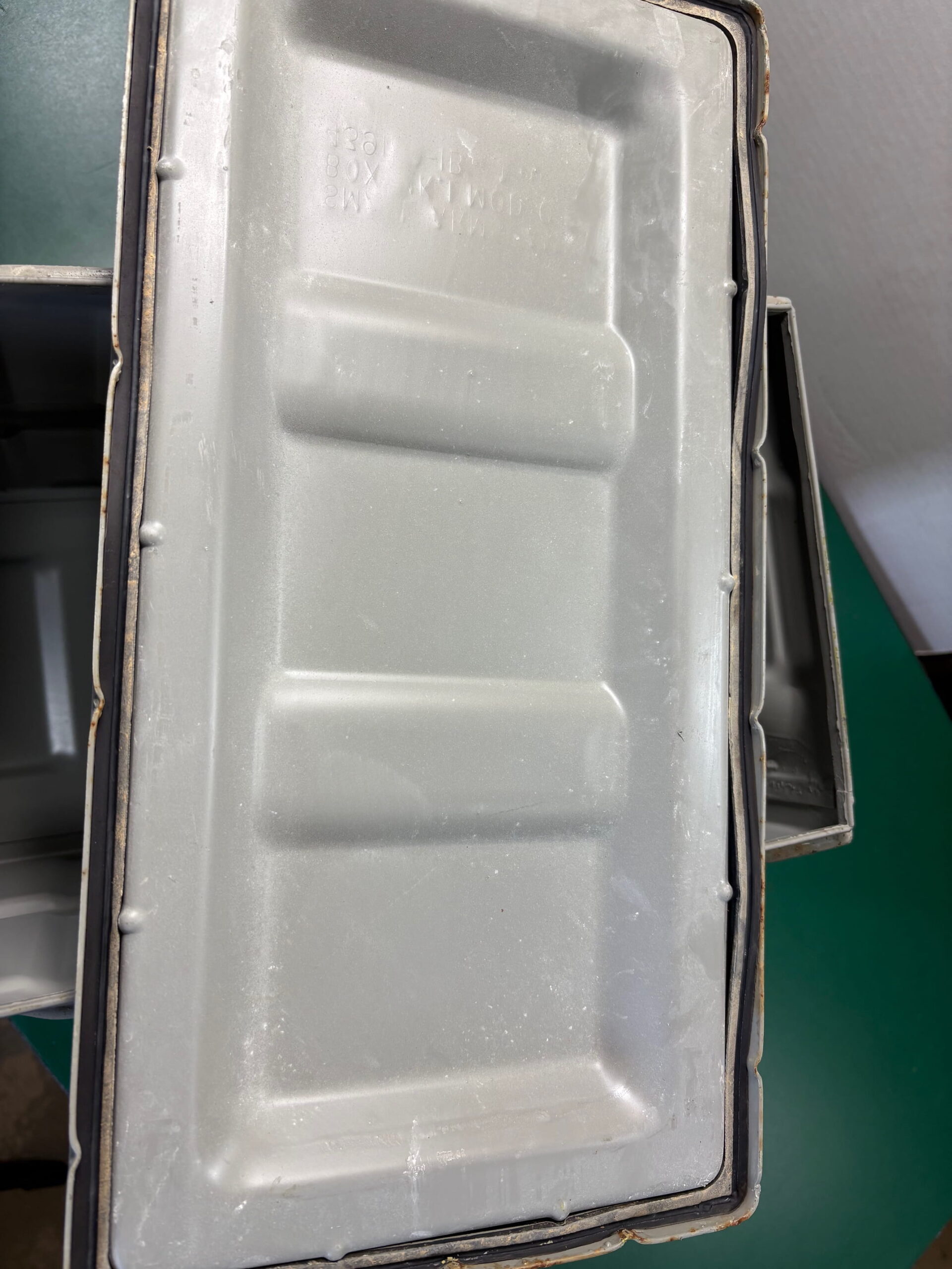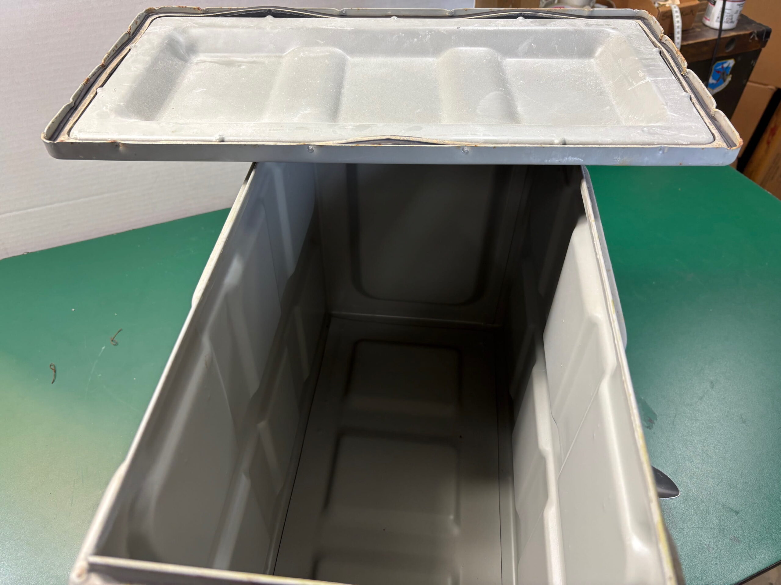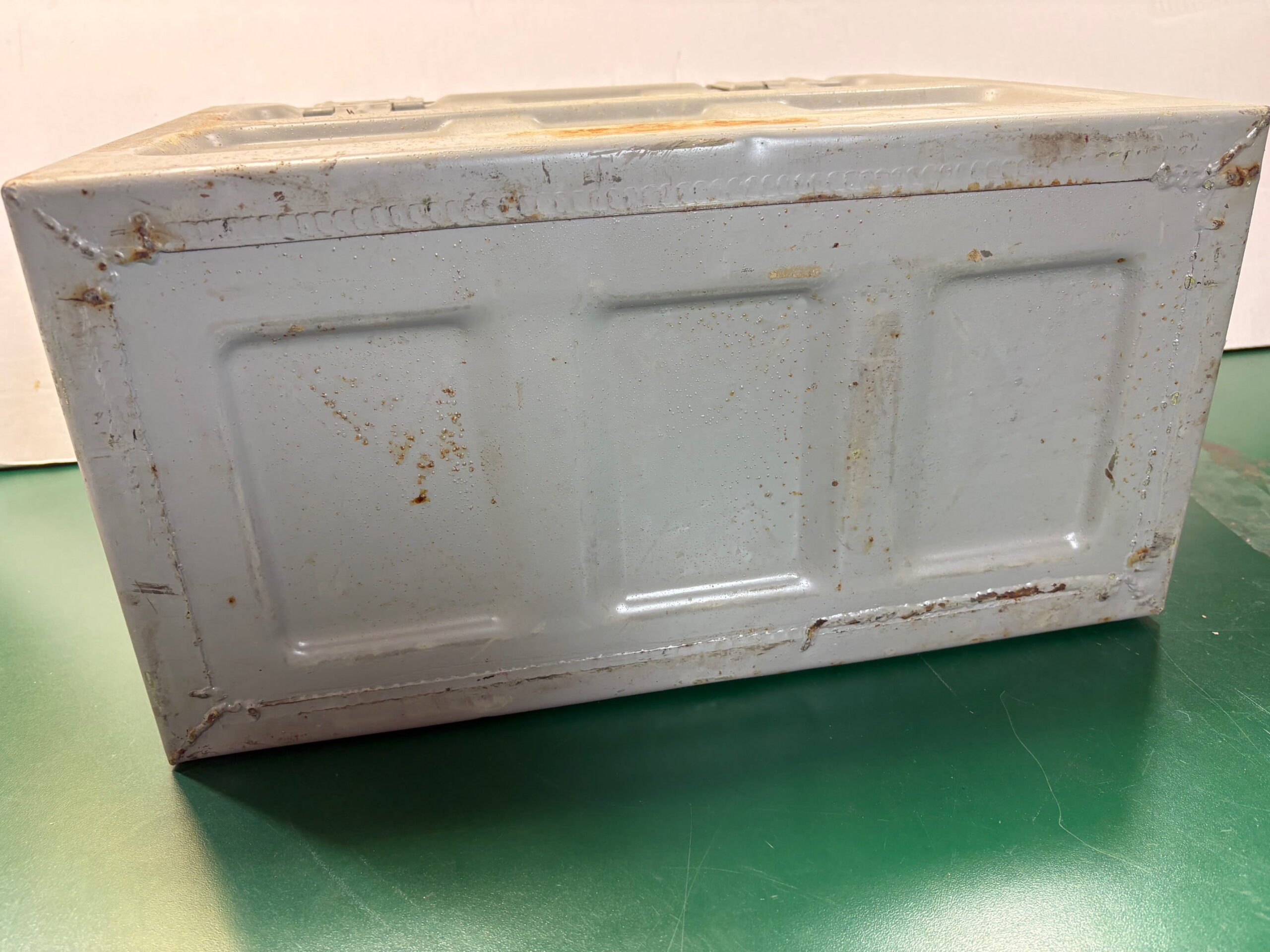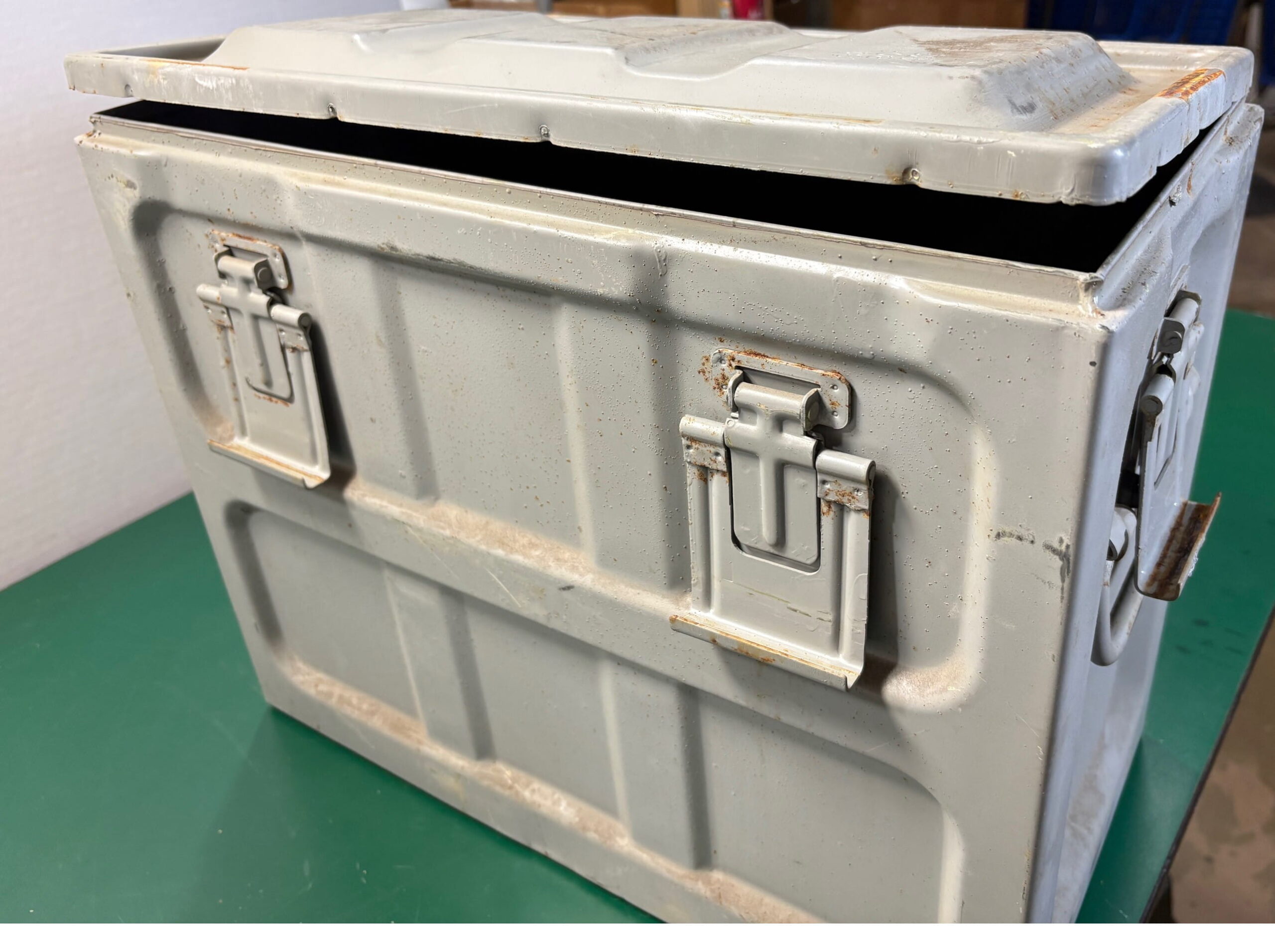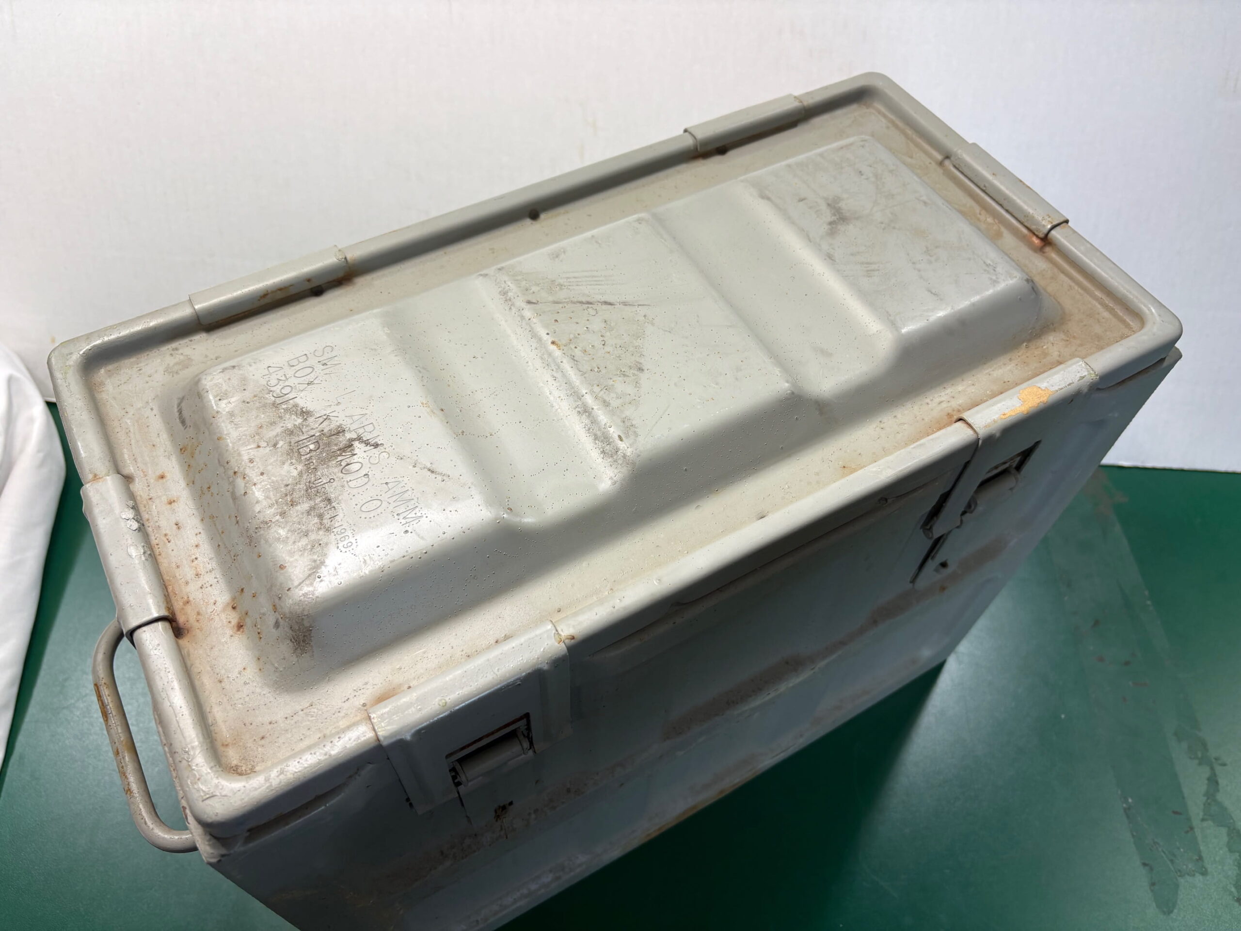 Steel 6 latch gray 20 mm ammo box. Removeable lid with live gaskets, double handle. Approx size 19 x 15 x 10. Used good condition with some storage wear and scuffs.