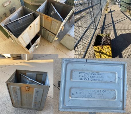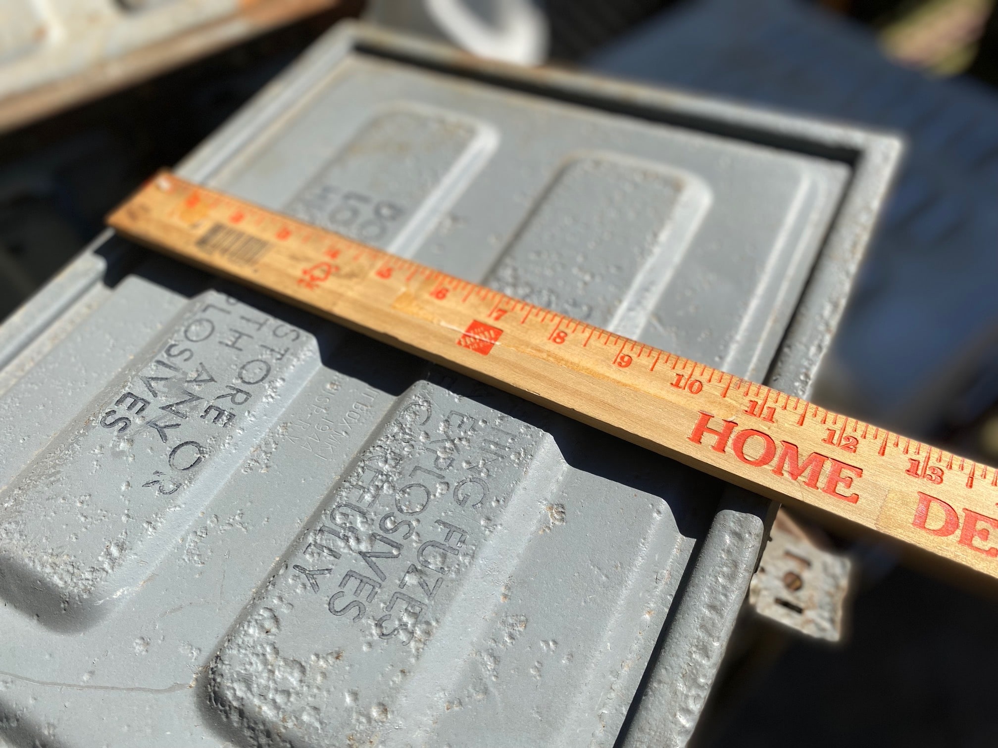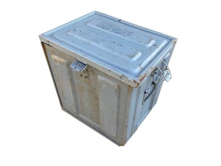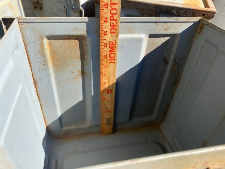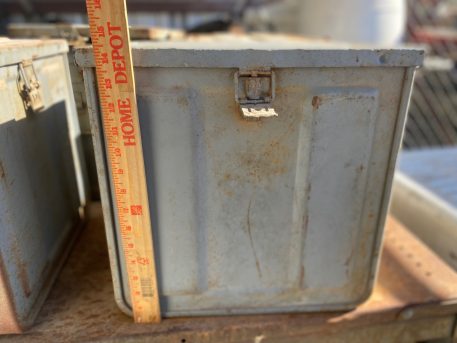 This grey cube box has an approximant dimension space of 14 1/2” x 14 1/2” x 11 1/2” inches. Latching hood that comes completely off. Has been used for variety purposes, storage containers, even for planting pots! Weighs about 20 pounds. Overall good condition for a project. There will be some surface rust, dents and dings, discoloration from storage.