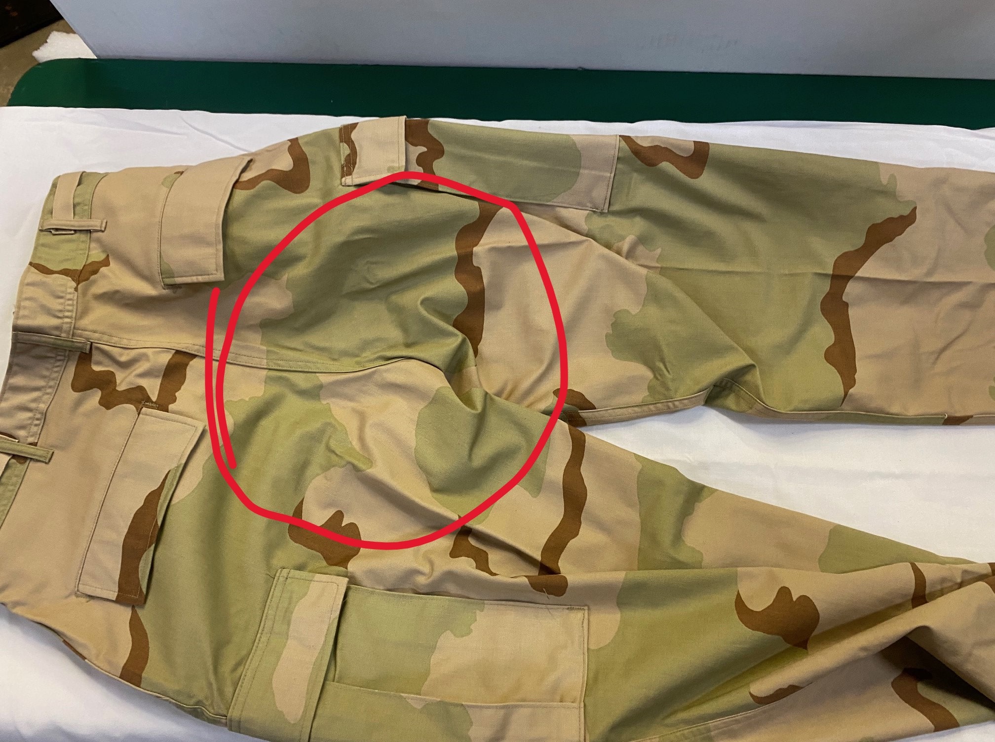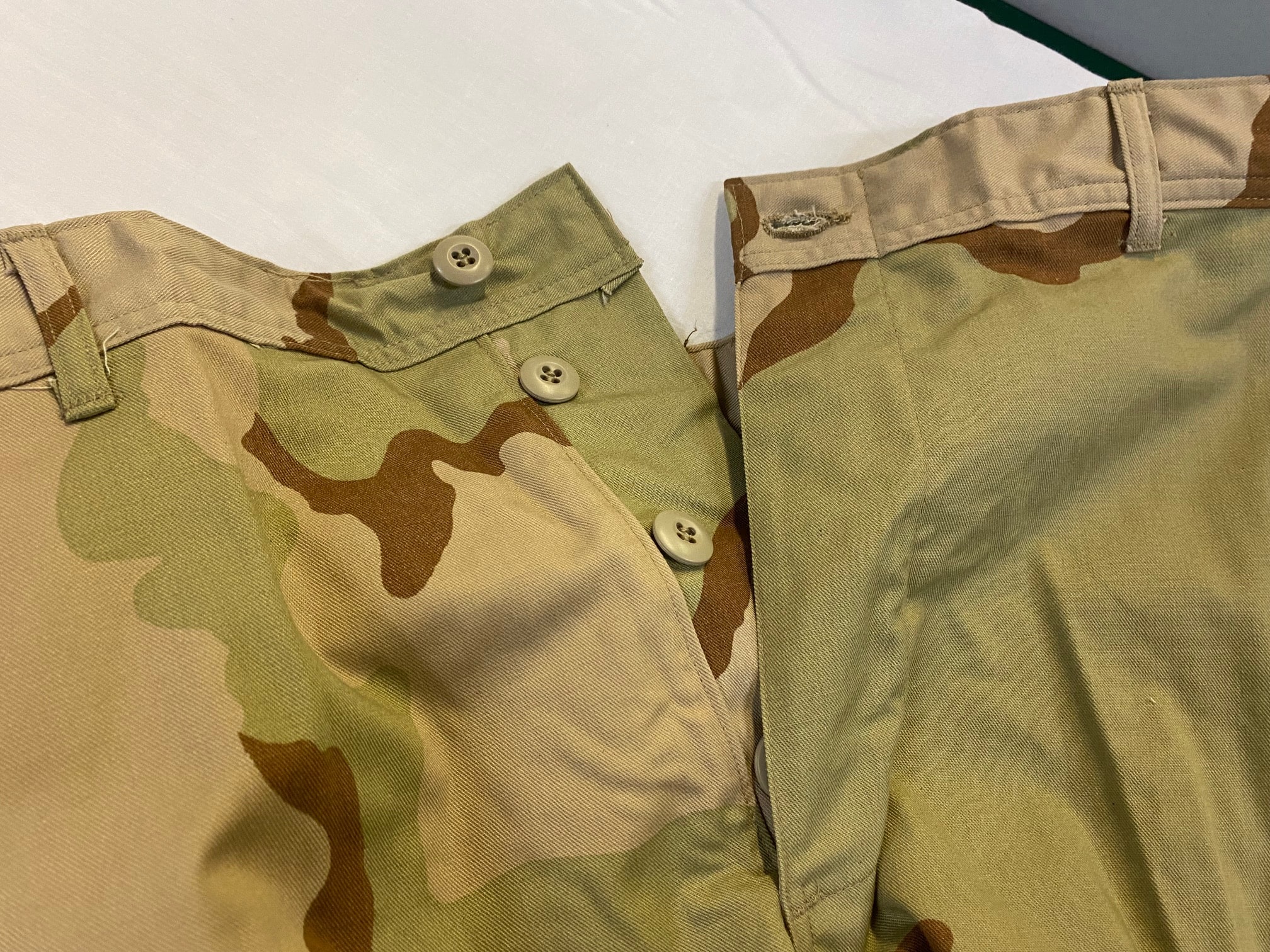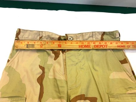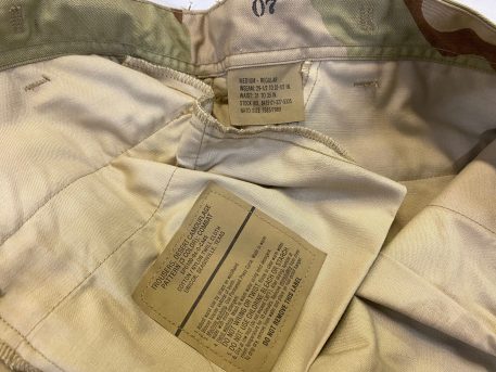 New old stock 3 color desert camo trousers. 1990 dates. Size Medium Regular only. 50 % cotton. 50 % Nylon *NOTE* These are an earlier version of the bdu, there is no seat pad on these, seat pad “stitching”
