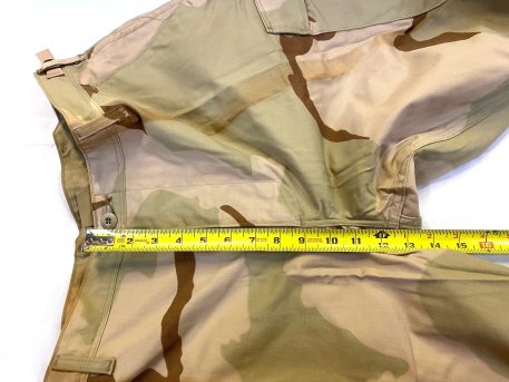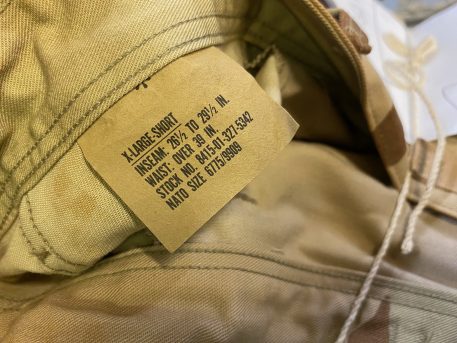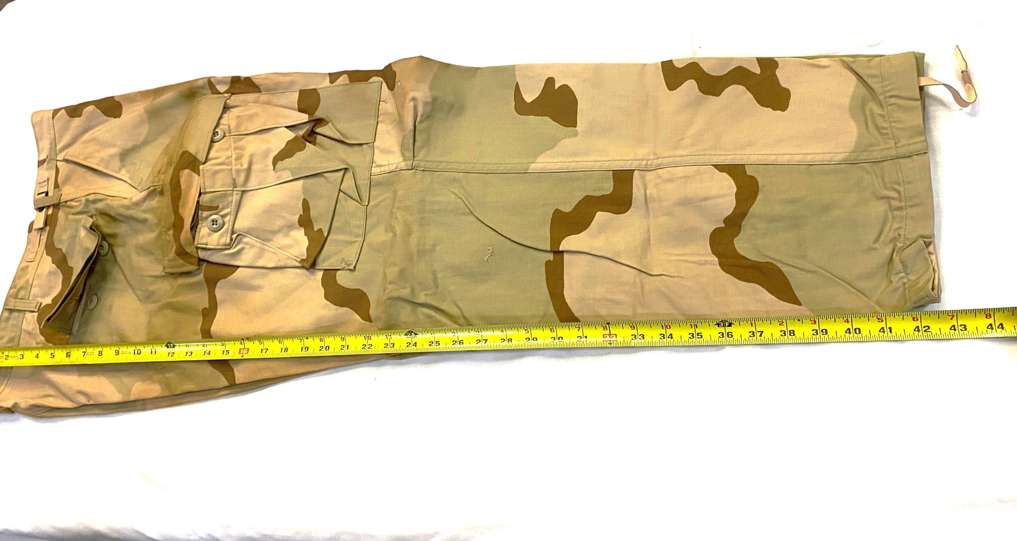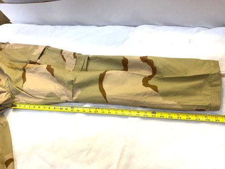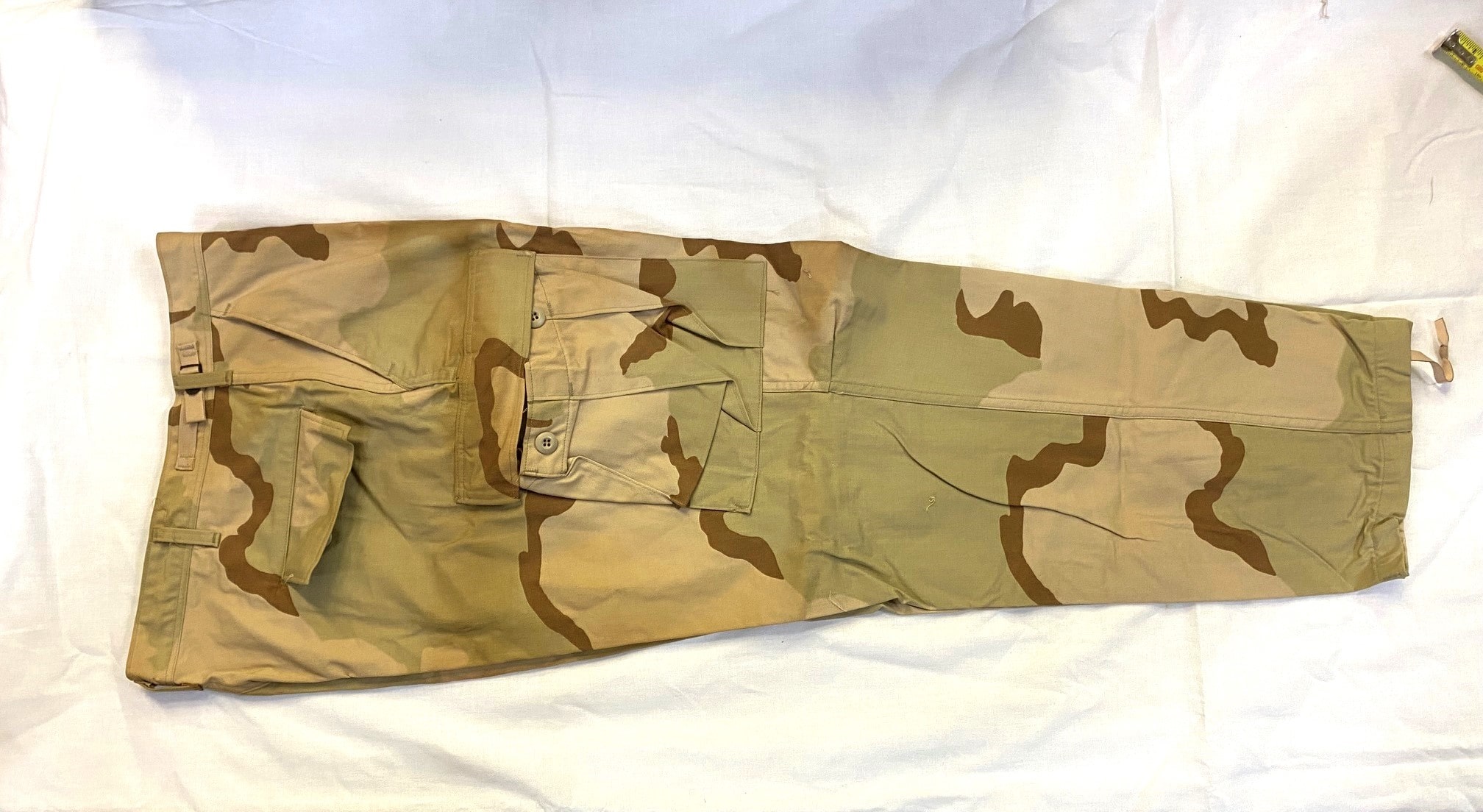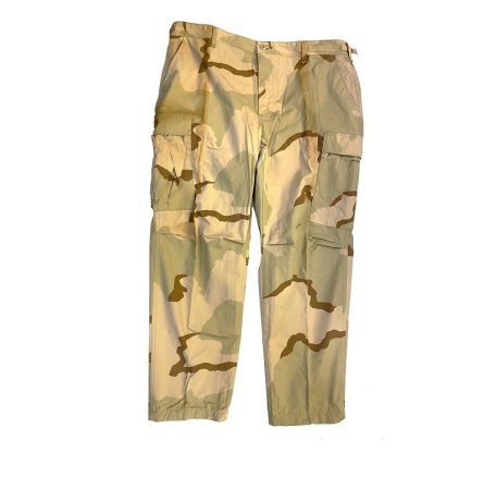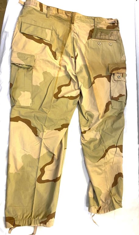 3 color bdu trousers from 1990’s! BROWNED AND STAINED condition, X-LARGE SHORT 3 color desert camo. **Browning from years of storage in original government boxes. This browning can be anywhere on the pants depending on where the pants was touching the side walls of the box.**