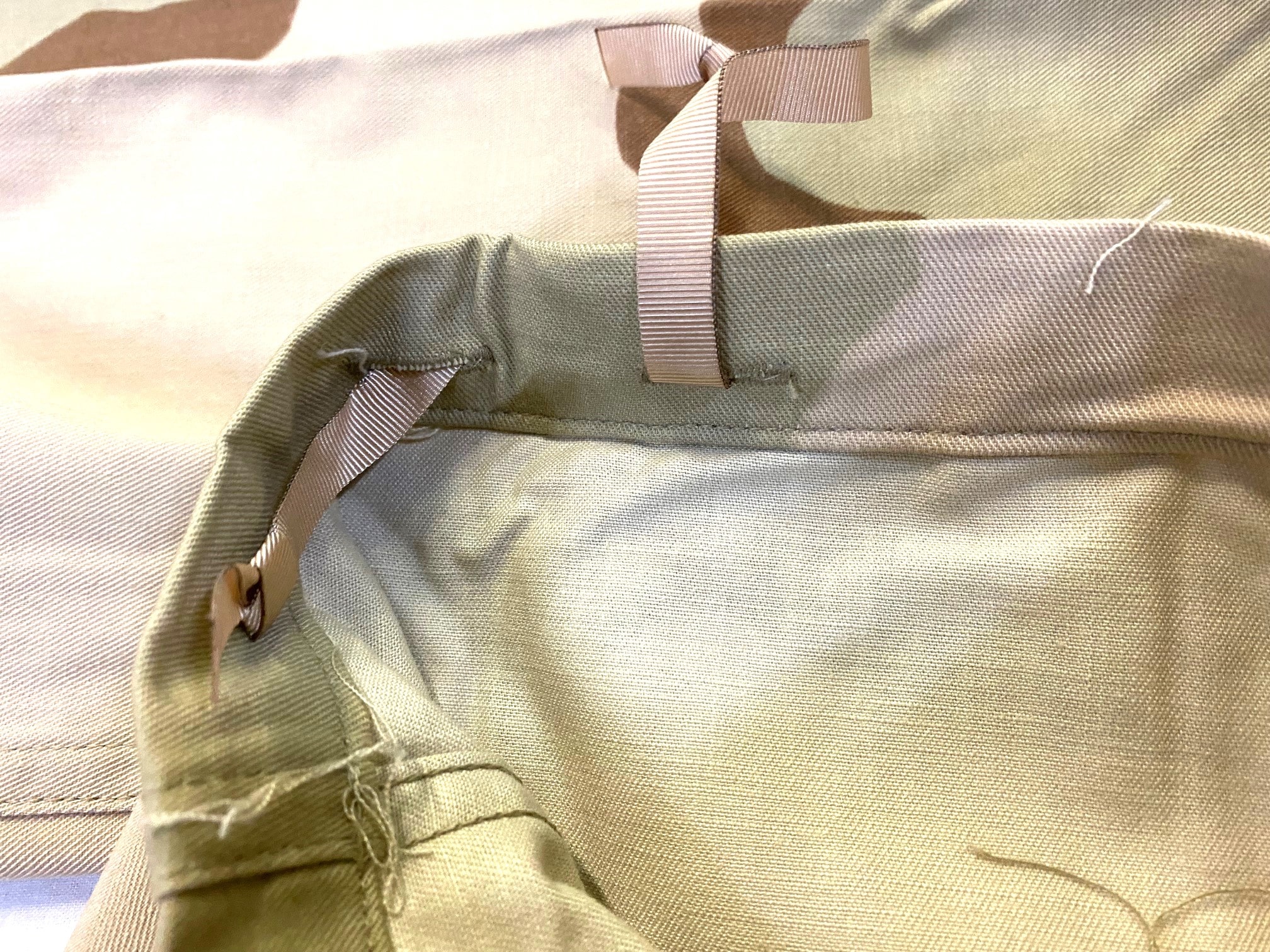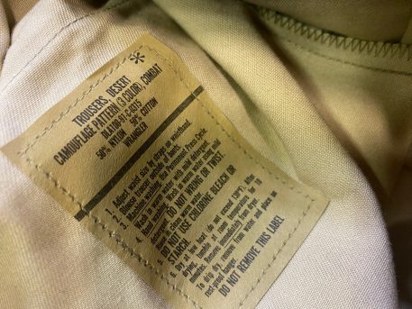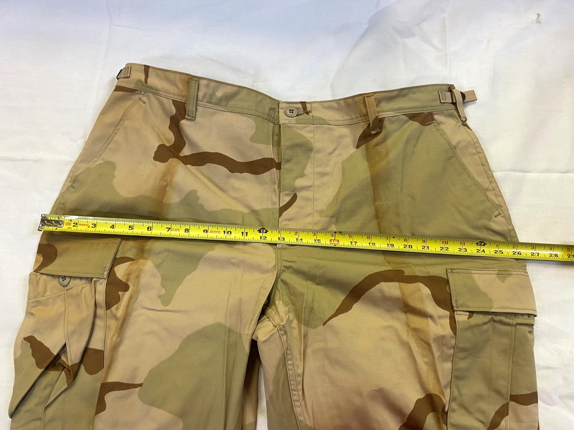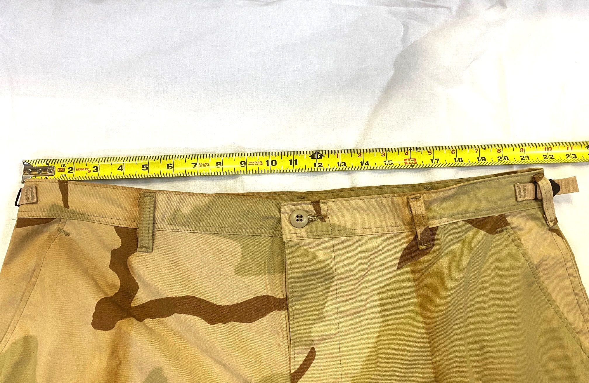 3 color bdu trousers from 1990’s! BROWNED AND STAINED condition, X-LARGE SHORT 3 color desert camo. **Browning from years of storage in original government boxes. This browning can be anywhere on the pants depending on where the pants was touching the side walls of the box.**