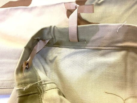 *BROWNED AND STAINED* 3 color desert camo trousers. 1990 dates. Size Xtra-Large Short . 50 % cotton. 50 % Nylon *NOTE* These are an earlier version of the bdu, there is no seat pad on these, seat pad “stitching”.