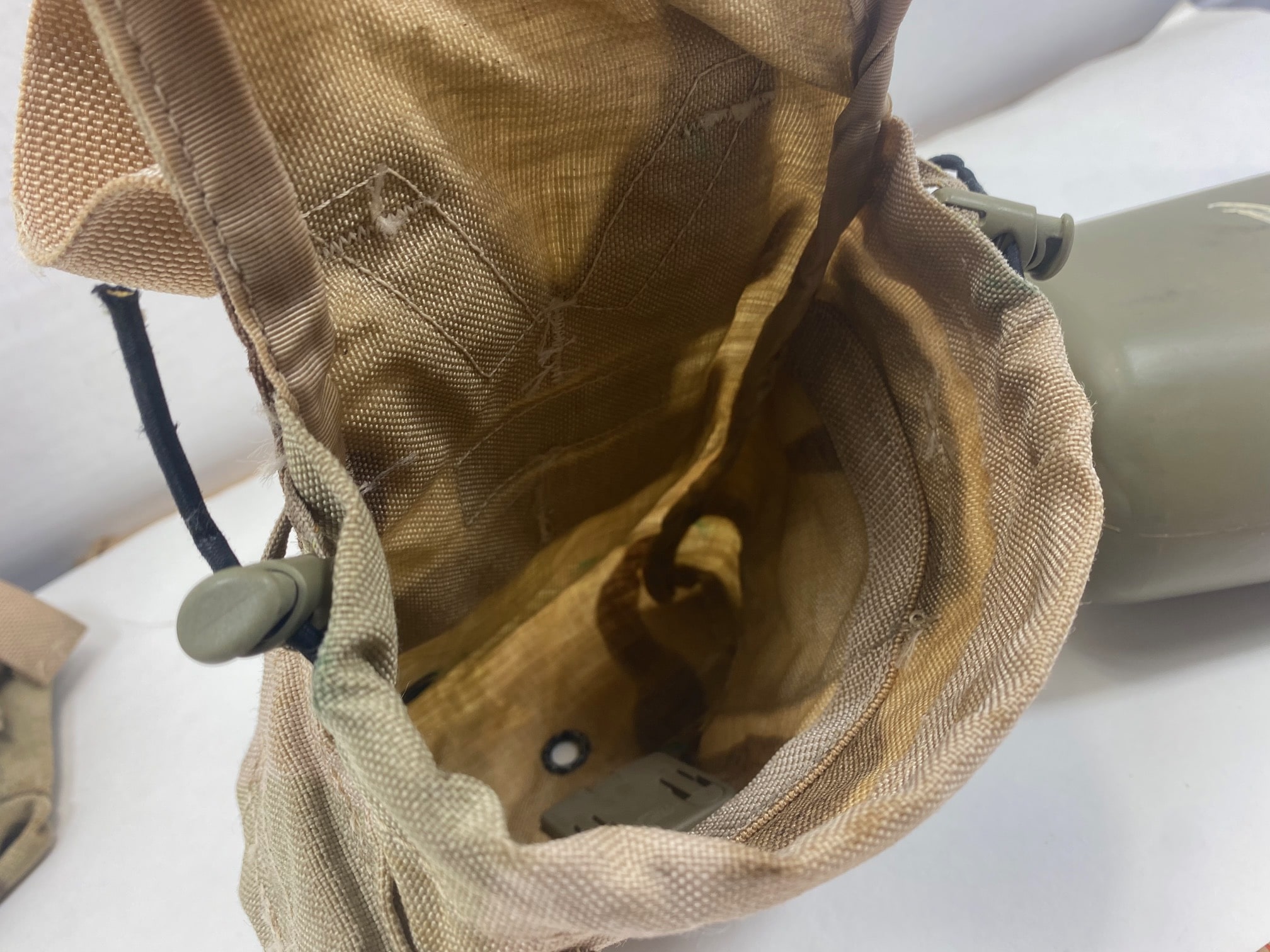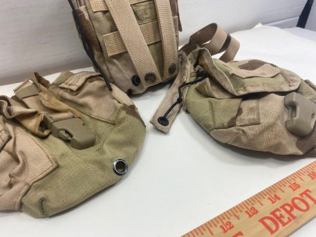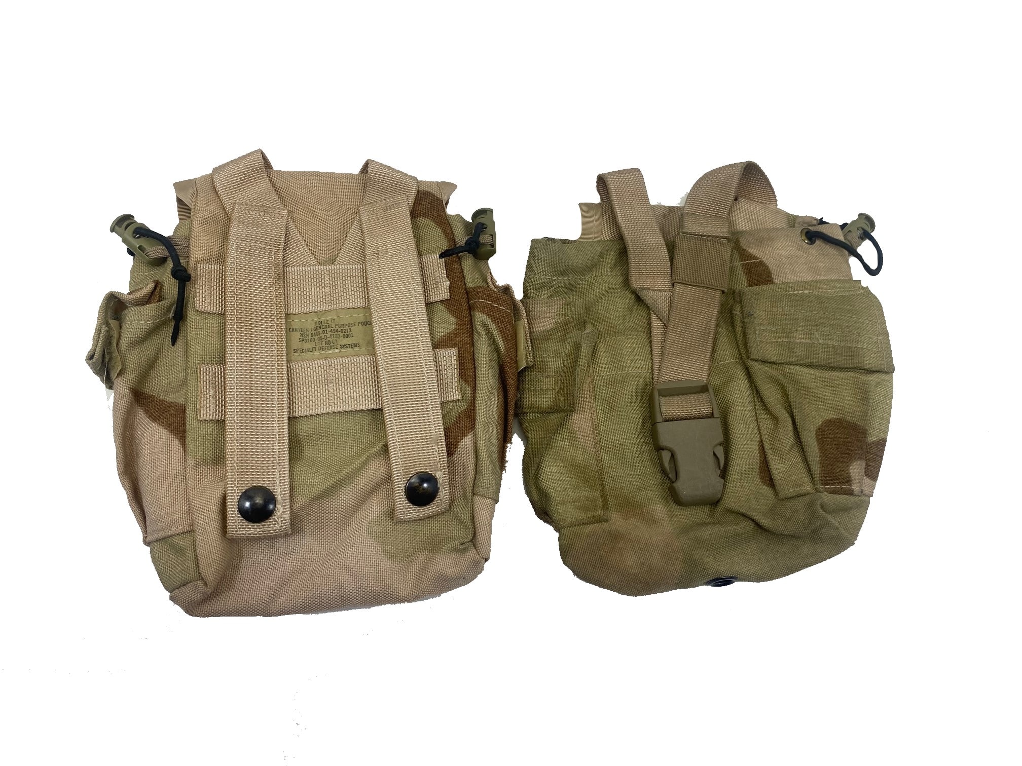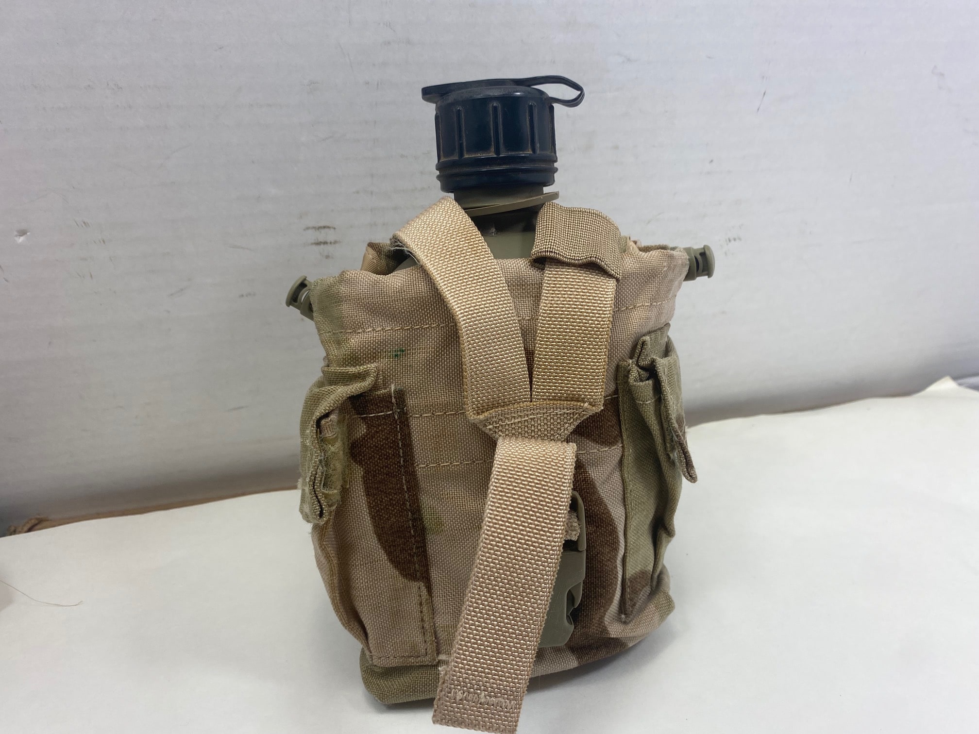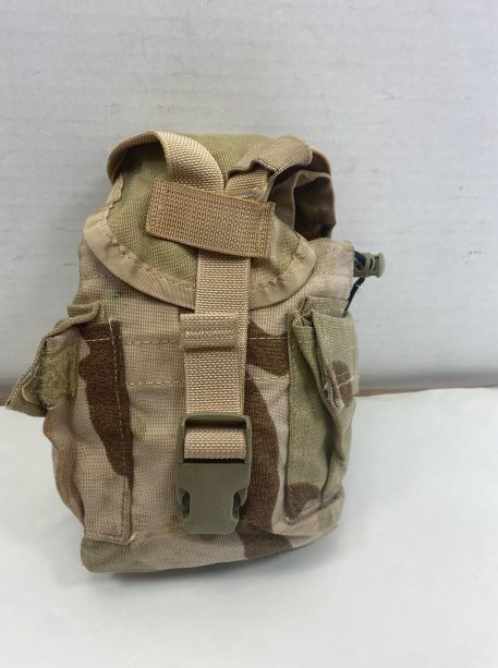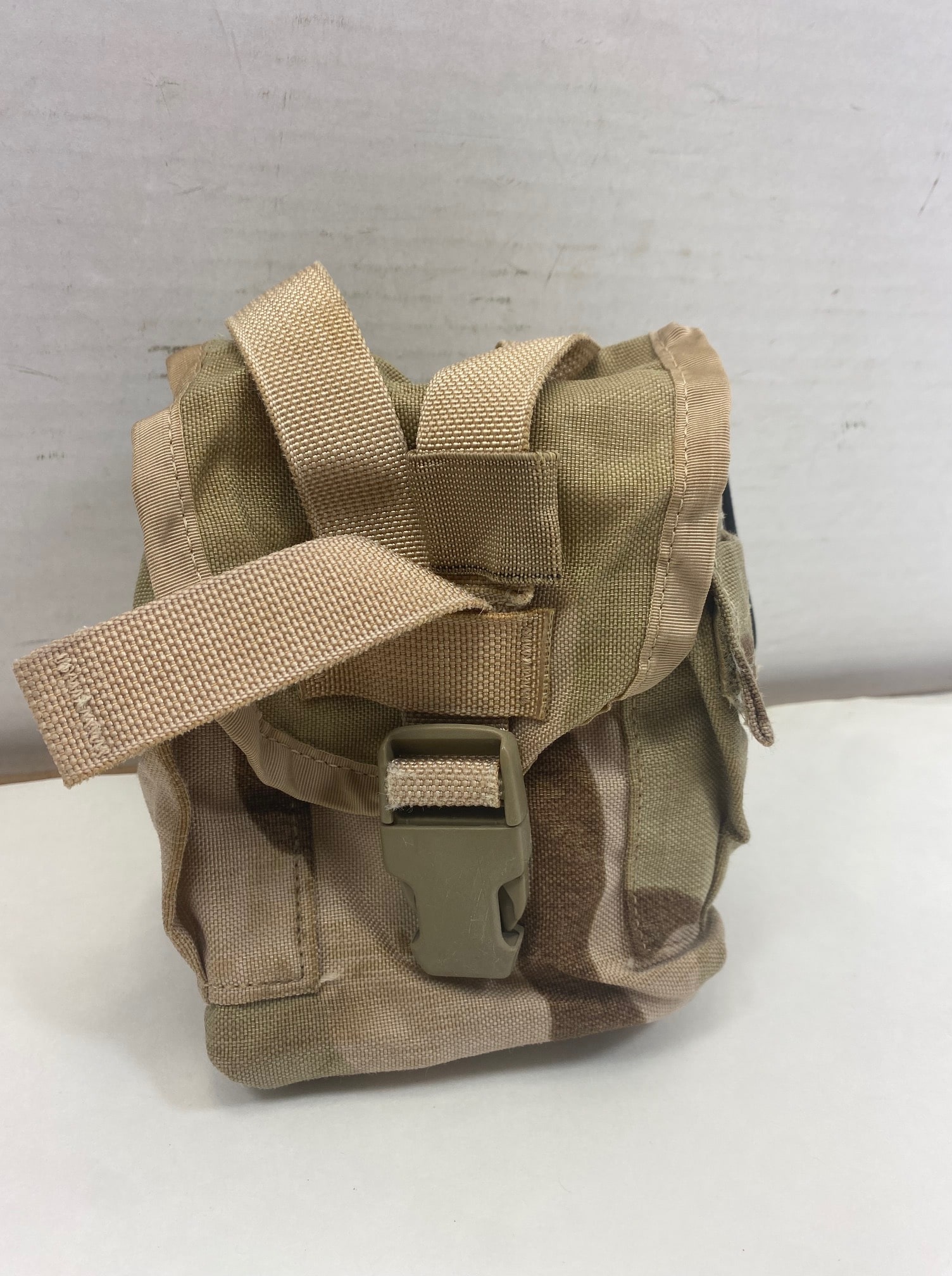 Molle integrated 3 color desert camo canteen cover. Holds 1 quart canteen, molle adjusters on back (no alice clips). Used-good/fair condition. Some staining and discoloration. All working parts.