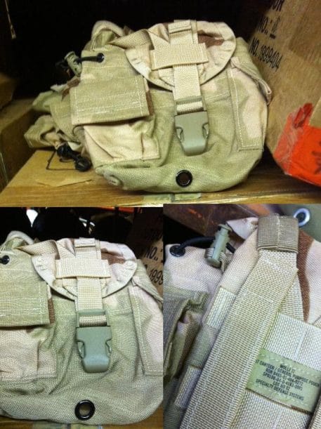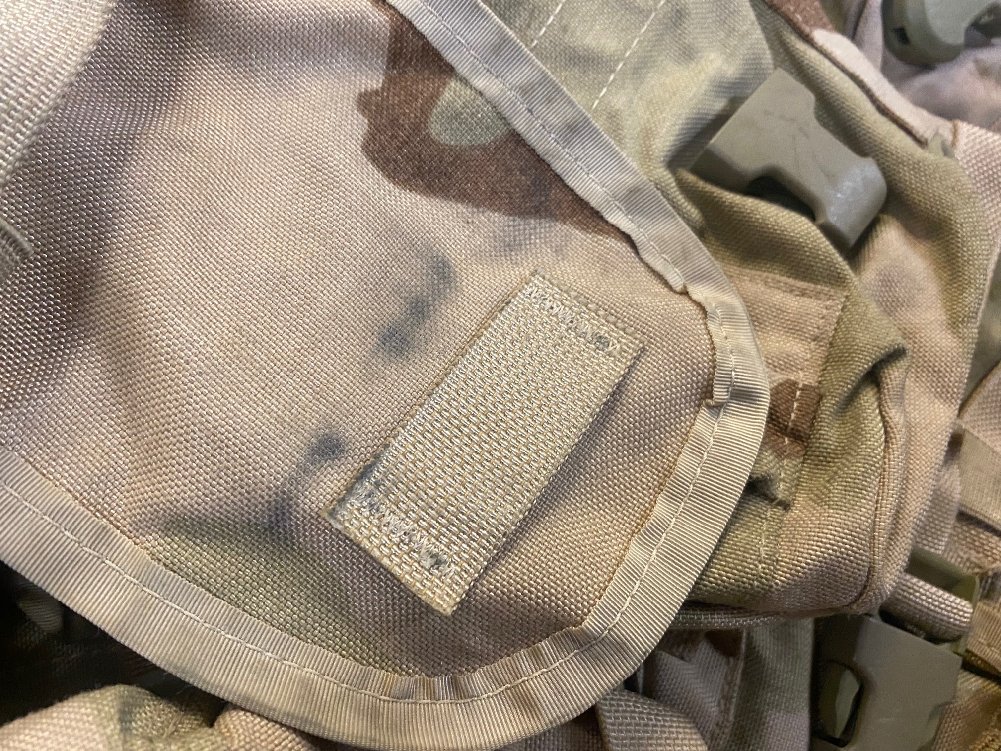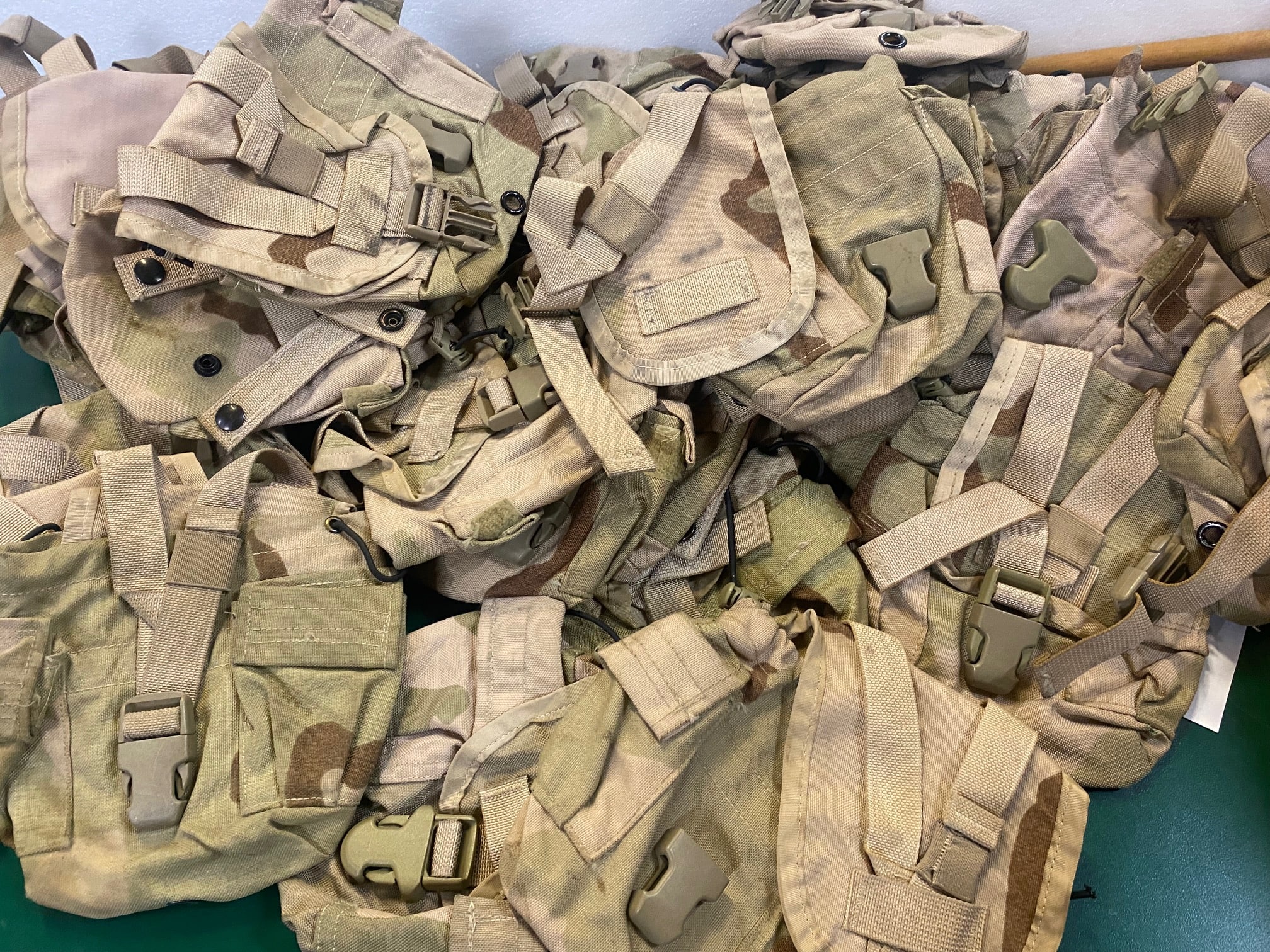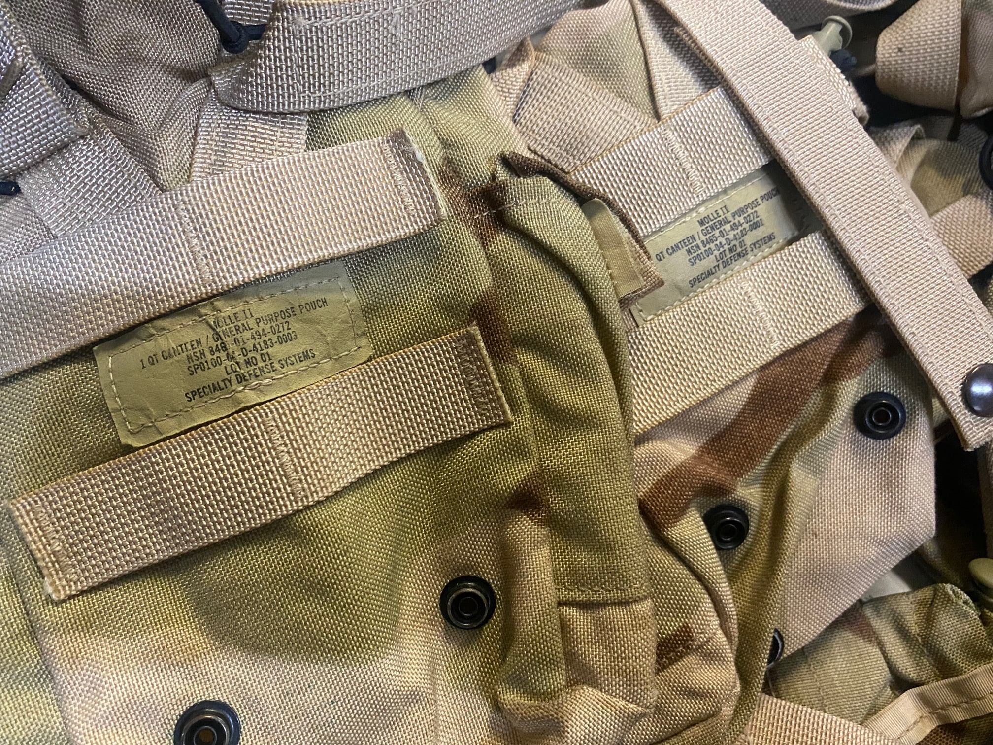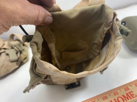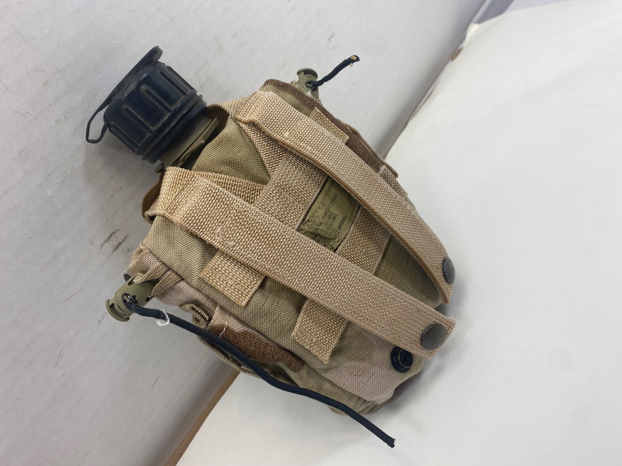 Molle integrated 3 color desert camo canteen cover. Holds 1 quart canteen, molle adjusters on back (no alice clips). Used-good/fair condition. Some staining and discoloration. All working parts.