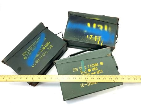 30 Caliber Ammunition Boxes. Approx. measurements are 3-3/4″ x 10-3/4″ x 7″. Used condition, with plenty of small dings, dents, and scratches. Styles of boxes will vary, most to all have painted over stencils.