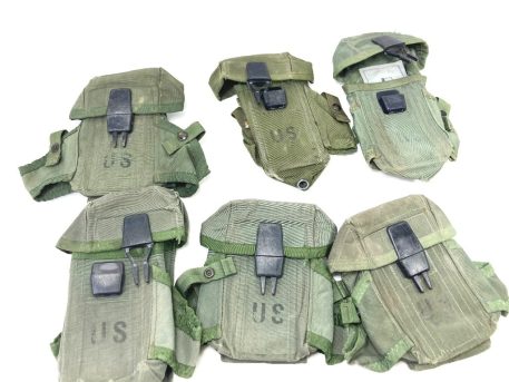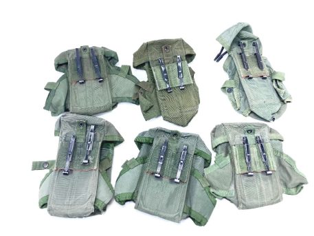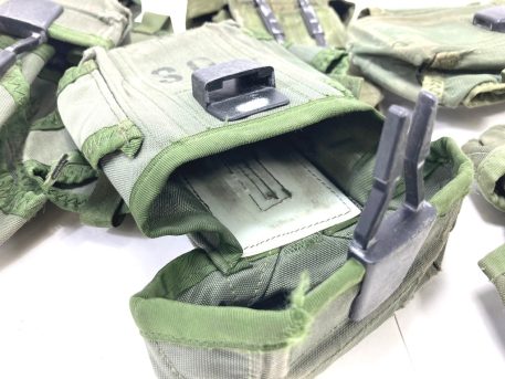 Carry your spare M-16 or AR-15 ammo in these used, GI issue M16 ammo pouches. Three 30 round magazines fit inside these olive green nylon pouches. Two ALICE clips on the back allows for attachment to most belts, webbing, or ALICE style packs or gear. Will also fit similar-sized 30 rd magazines in .223 / 5.56 NATO, such as the Mini-14.
