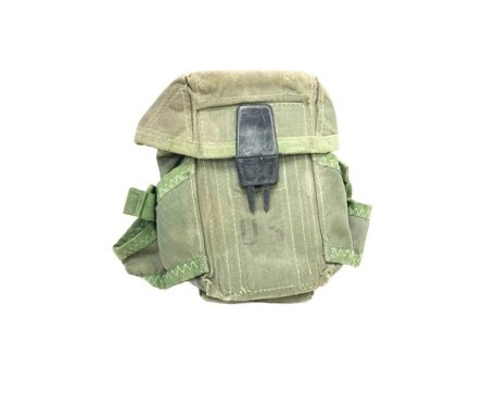 Two outer pockets made to fit hand grenades will also fit handheld radios, a folded pair of work gloves, and an assortment of other items. In “field tested” condition, with ample signs of use, but certainly serviceable for many years to come. Expect scratches on plastic buckles, scrapes, frays, and minor tears on the nylon, some rust and scratches on metal parts, and dirt/stains from storage and use.