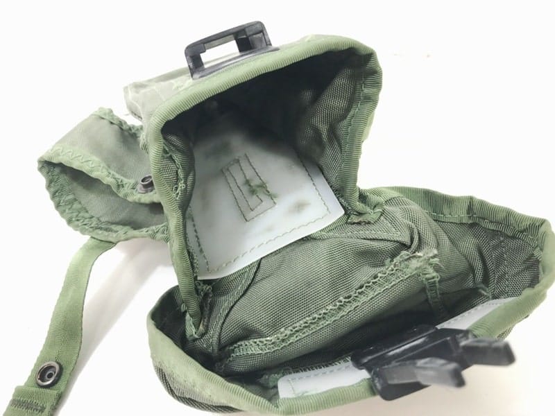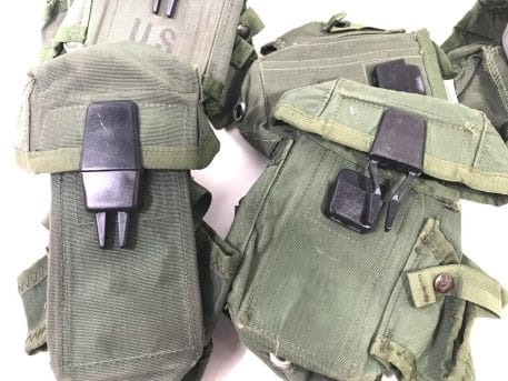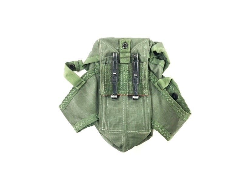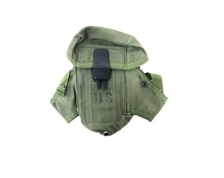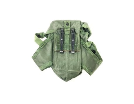 In the early days of Vietnam, these were made of heavy canvas and when they got wet, the canvas would weigh down the fighter. Around 1967 the military started experimenting with nylon to lighten the load and still give the strength needed to last in battle. Although the nylon is not as quiet as the canvas, it is far superior for damp environments. This pouch also features the grenade carriers located on each side of the pouch, just in case you have some grenades that you want to carry.