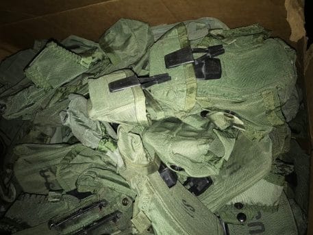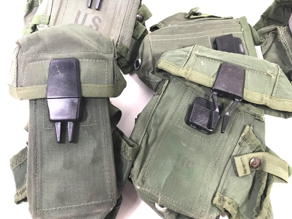 M16 military 30 round magazine pouch. Issue Army surplus alice clips for attachment to gear. Hold 3 30rd mag clips. Since Vietnam these mag carriers have been used by our military to hold extra ammo for the military rifle.