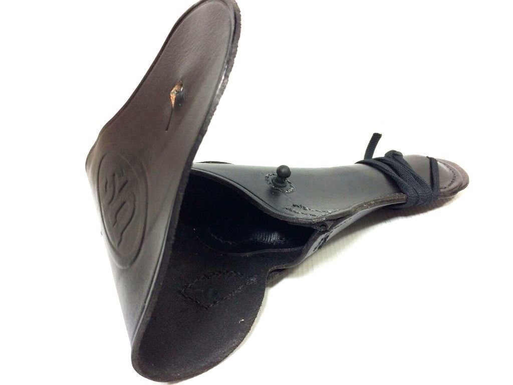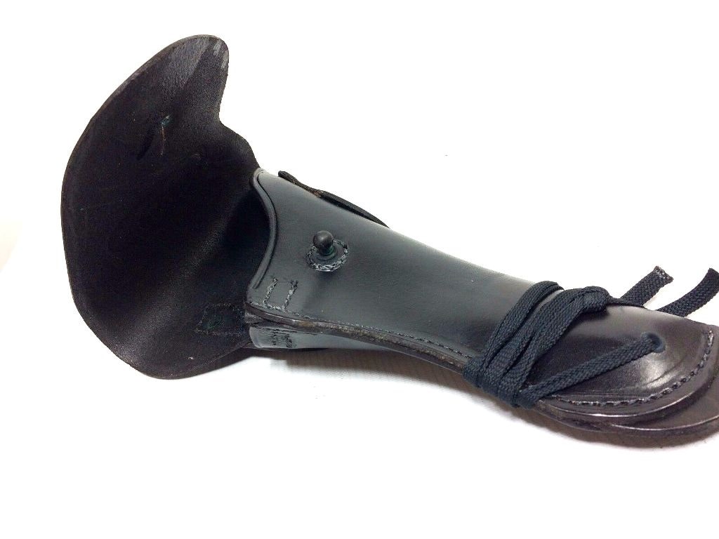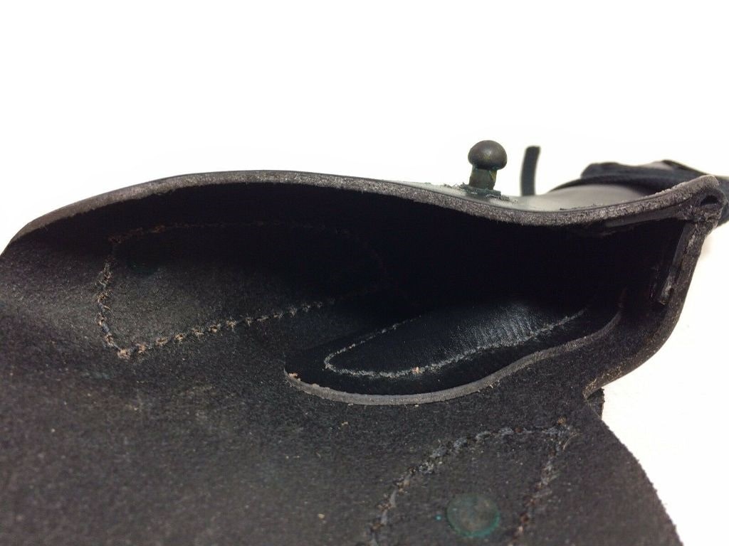 Military issue holster for the M1911 45 cal holster with flap to wear on the hip. Leather holster has a slot in the back to pass a leather belt through and also WW2 type metal fastener to secure to holes in the canvas or nylon pistol belt. M1916