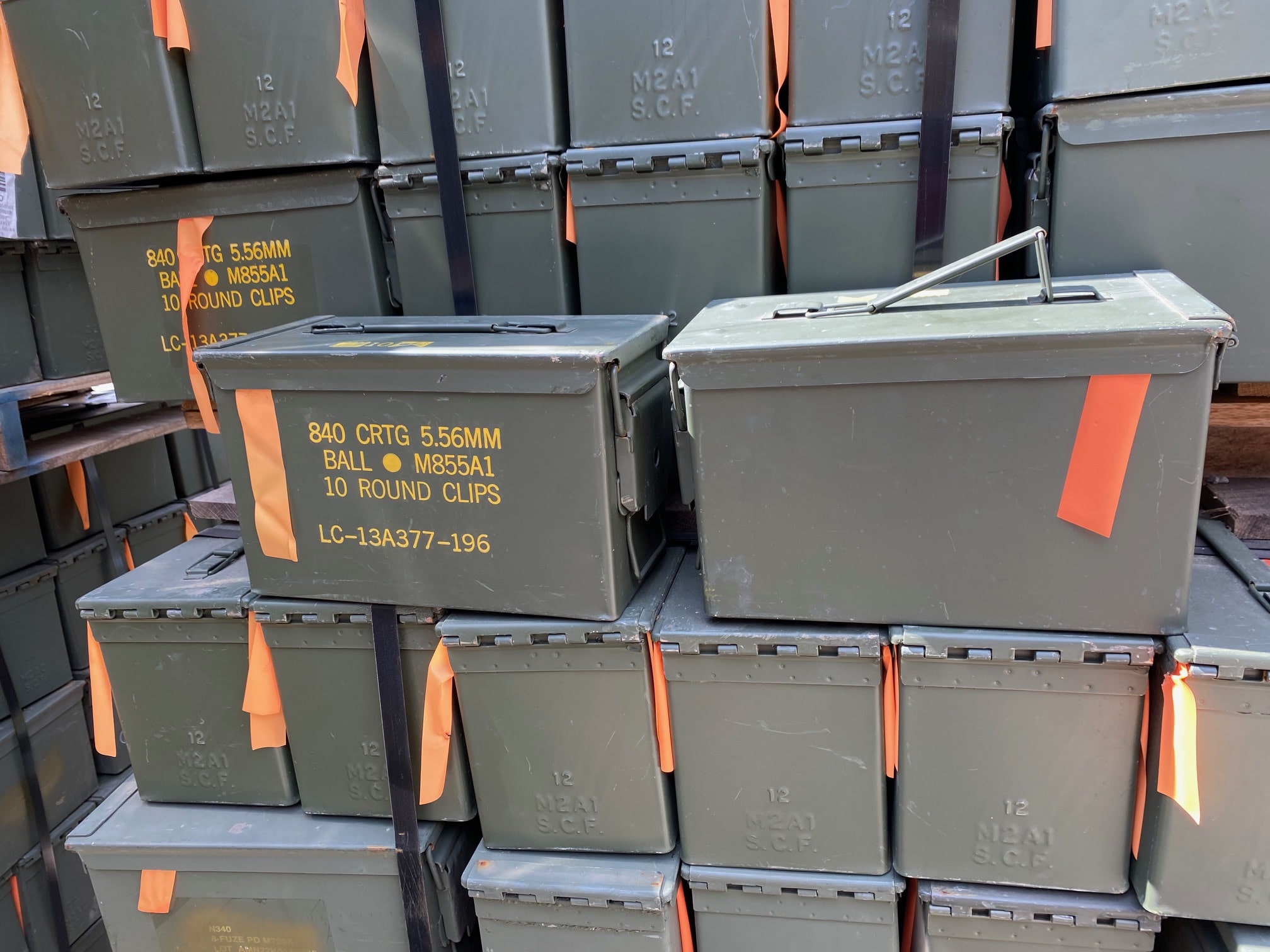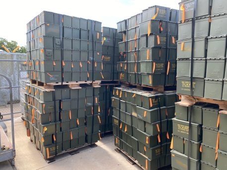 50 caliber ammo boxes by the pallet, 168 ammo cans per pallet sale! Available by in store pick up or LTL Motor Freight shipping. Details below.