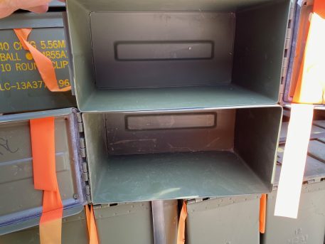 50 cal ammo boxes by the pallet 168 per pallet. These are number ones! Little bit of dirt inside, low surface rust on all of them. We do not check all of these—about 95% of them seem to be just fine. One or two in the middle may have a broken handle/dent. Weight of the pallet is approximately 850 pounds and the size is 48 x 40 x 50 tall. Will have to go LTL freight shipping on these and we can provide a quote upon your request.