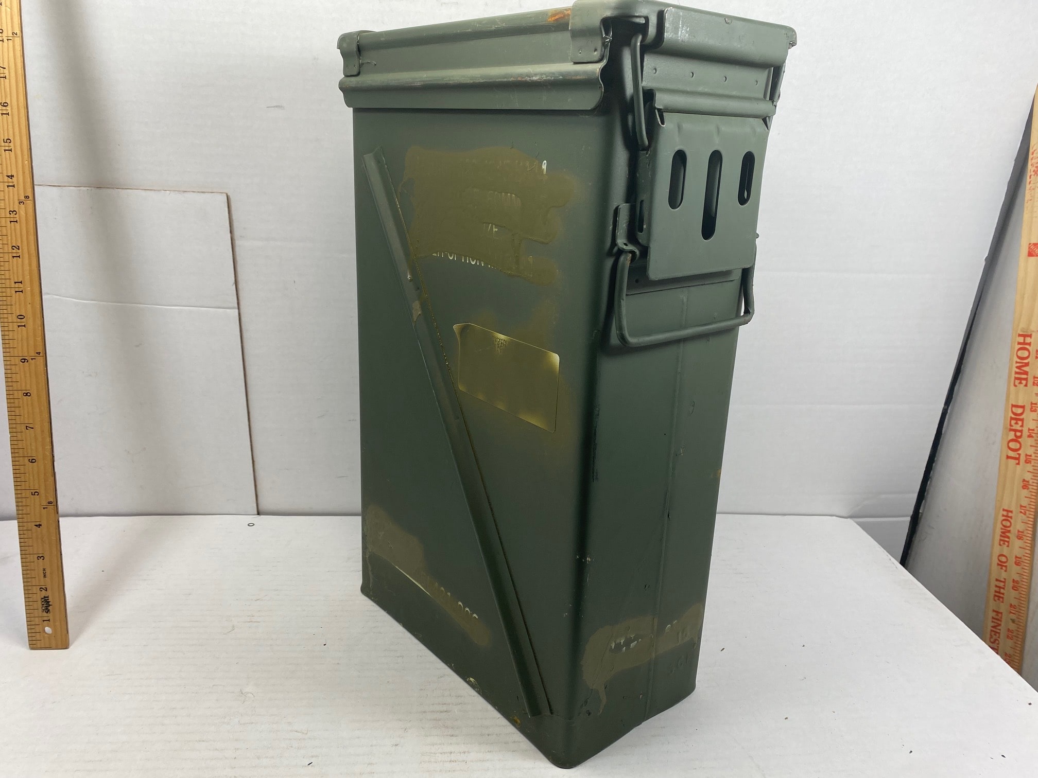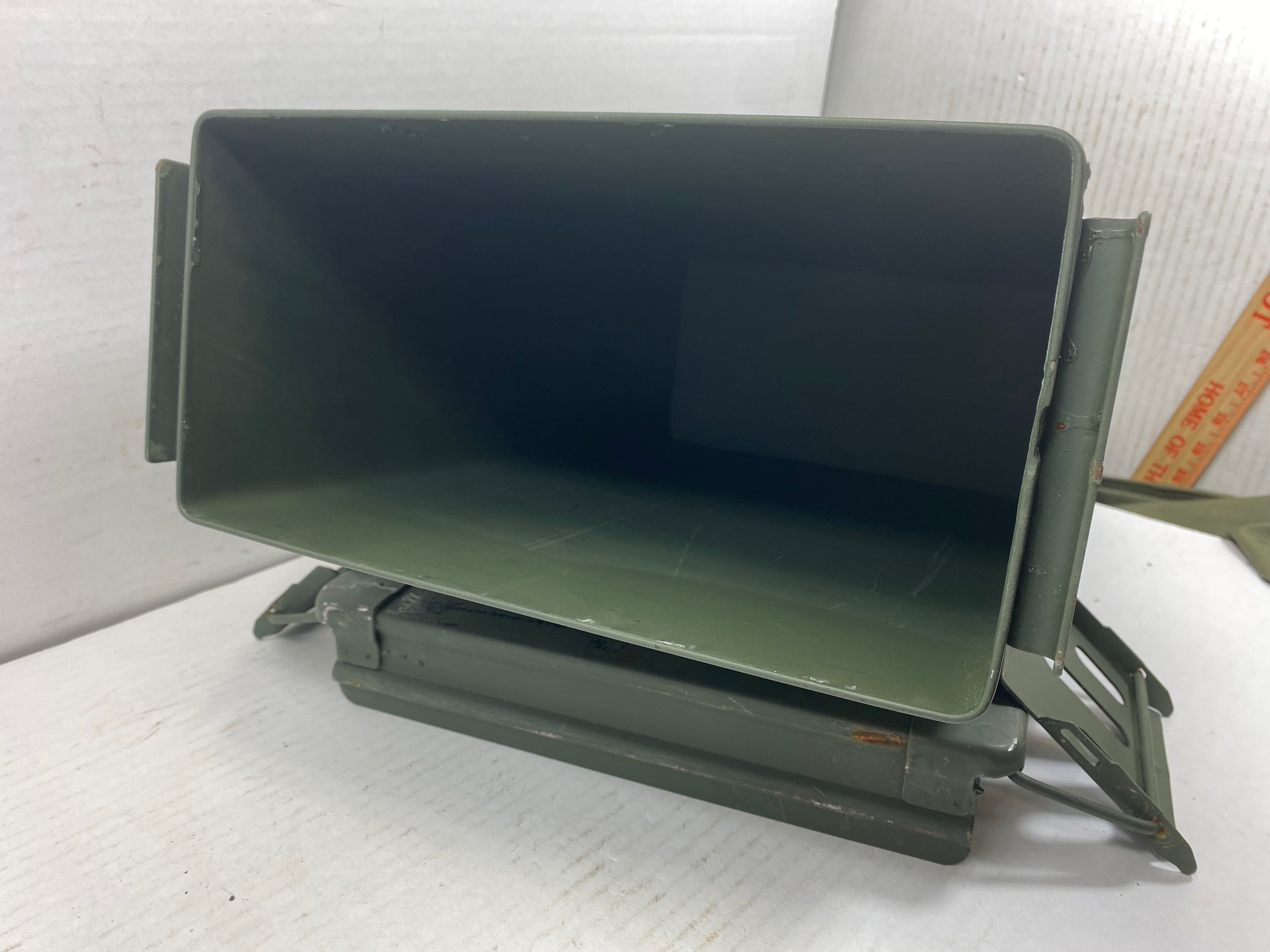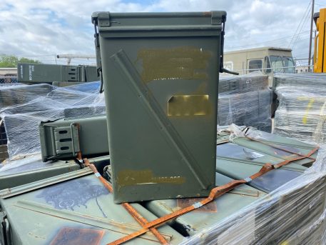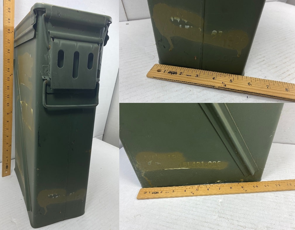 US ARMY 60mm 19” Tall ammo can. A taller version of the PA70 16” with dual latch handle lid. Used good condition, gaskets are good. Some dents from storage and use. Dual latch handle lid system similar to bigger ammo boxes like the 20mm, 30mm, and 40mm.