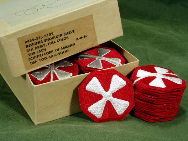 Original Vietnam issue 8th Army insignia. Shoulder patch in full color. New right out of the 1969 dated government packaging. Price is per each patch.