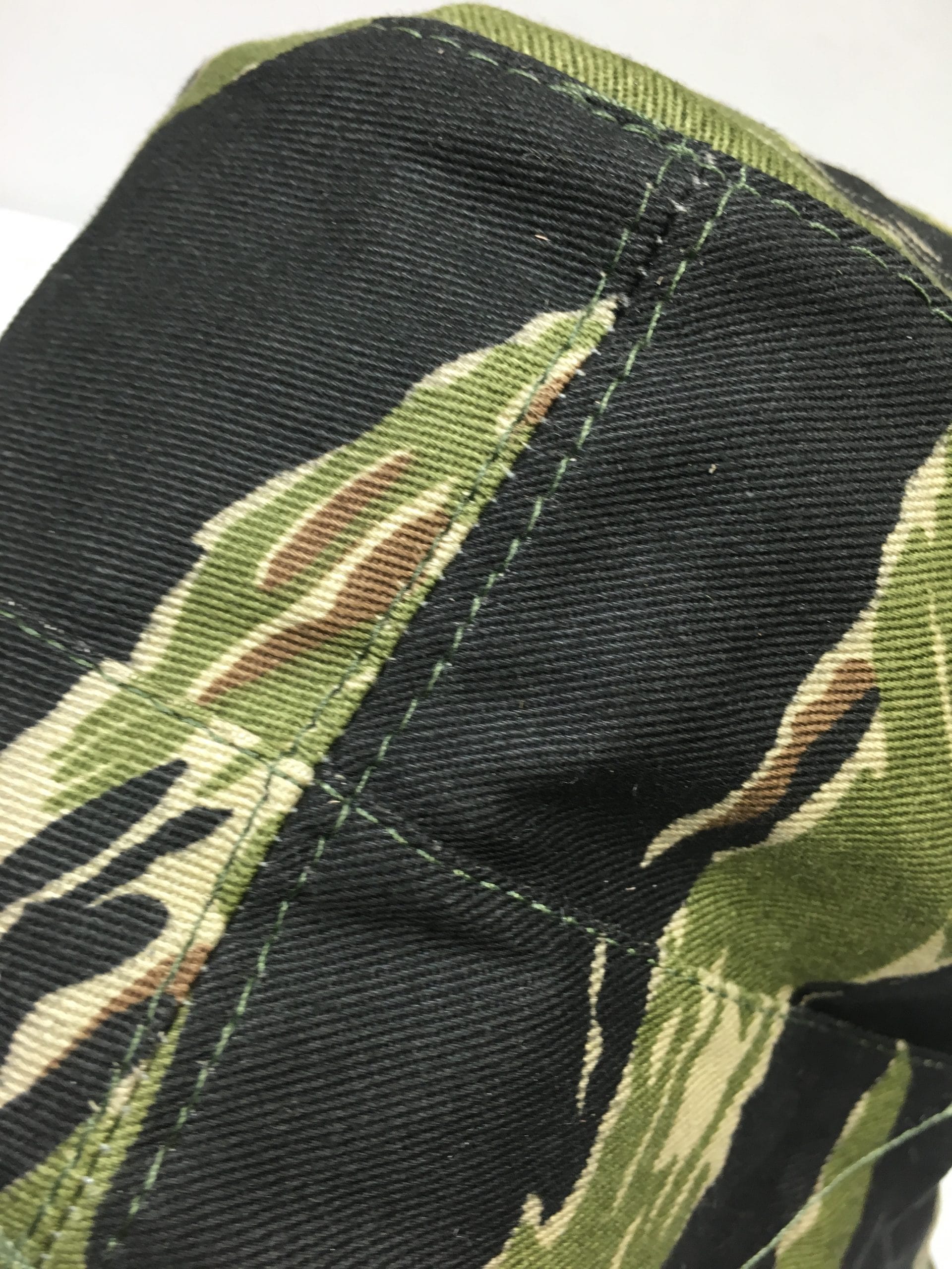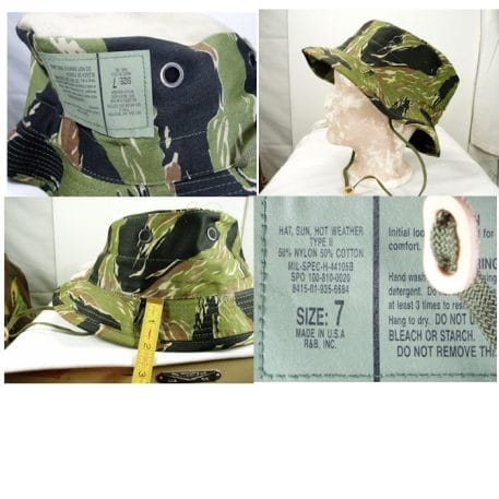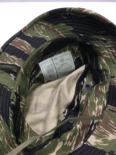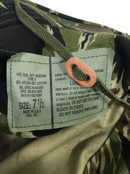 Advisor style tiger boonie hat. Made just like the ones form Vietnam, by R and B Distributors in the U.S.A.. Current reproduction manufactured with government special forces contract 100% cotton twill tigerstripe cloth. Cotton material and shortened brim (1 3/4″) just like the Duke wore in “The Green Berets.” They run big, but will shrink down to size with wash. SIZE 7 1/2 ONLY