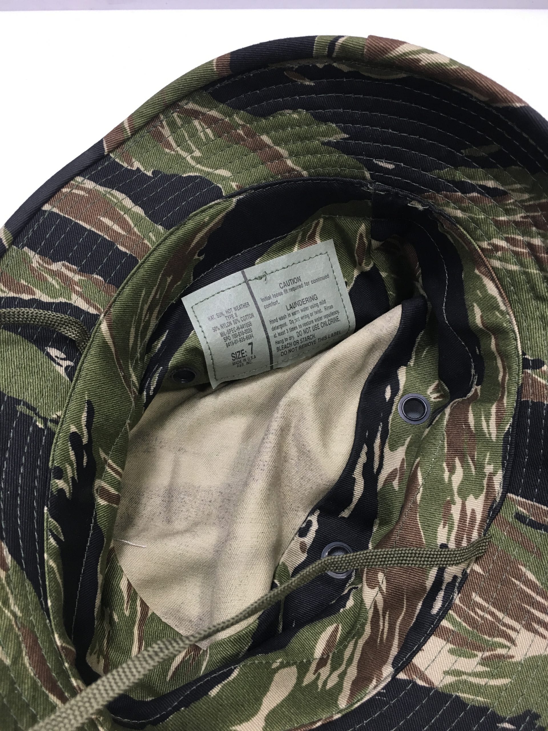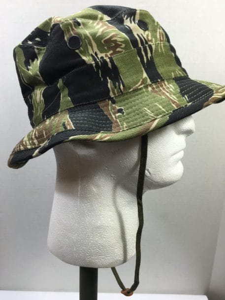 The boonie hat was introduced to the fighting forces during the Vietnam War when the US Army Special Forces “green berets” began wearing them in the field along with the Australian and Republic of Vietnam units. These leopard spot or tigerstripe boonie hats were locally from salvaged camo cloth found in the field. sometimes they were made from parachute material as well. The name Boonie is a derivative of Boondocks. by 1967 the US Army began issuing boonie hats as” Hat,Jungle,with Insect Net” made of cotton and wind-resistant poplin, in olive drab,tigerstripe, and ERDL pattern.