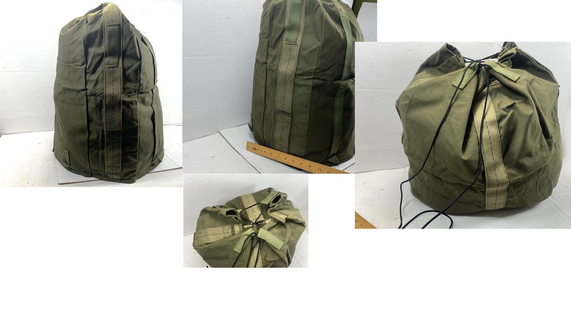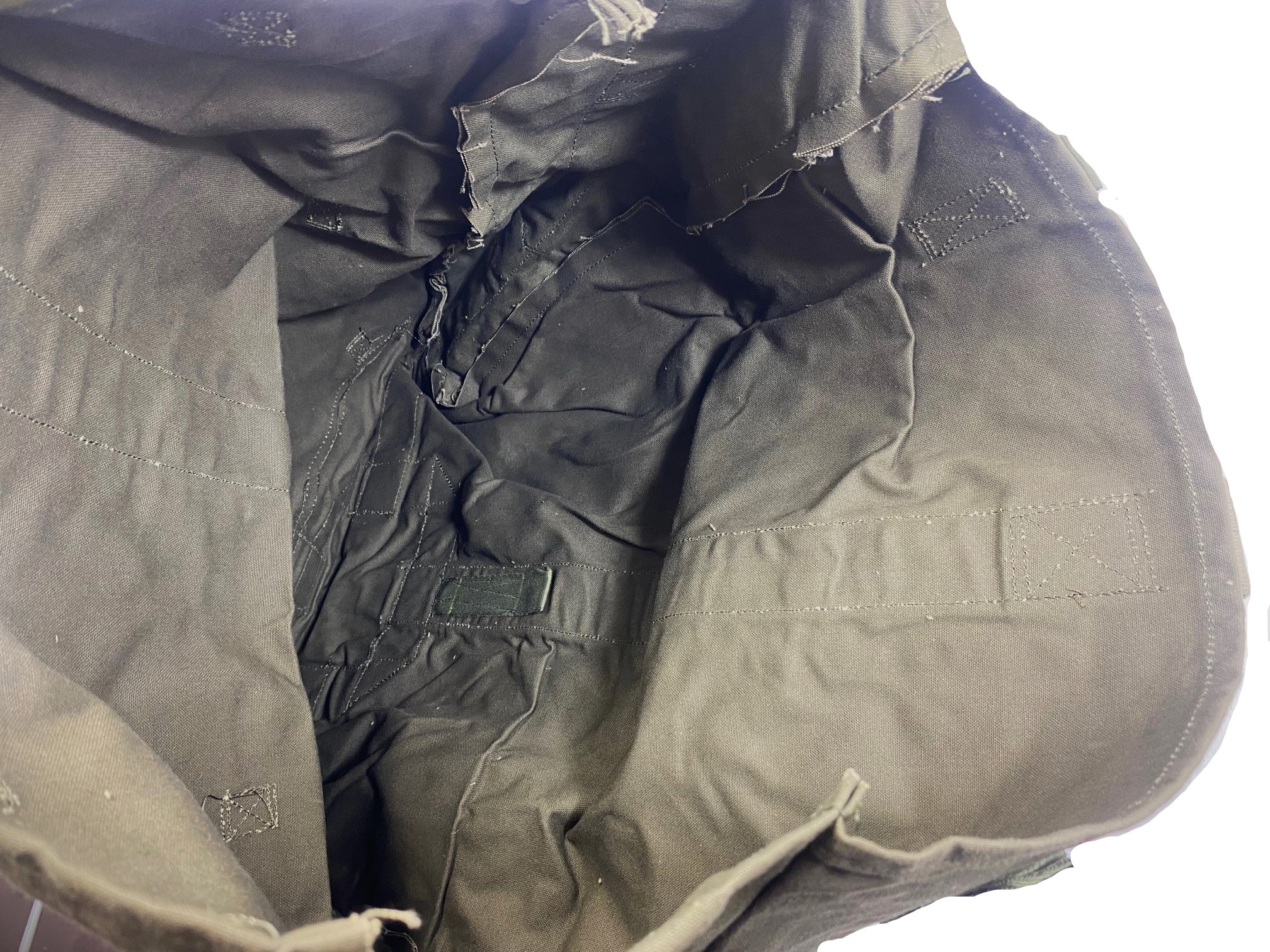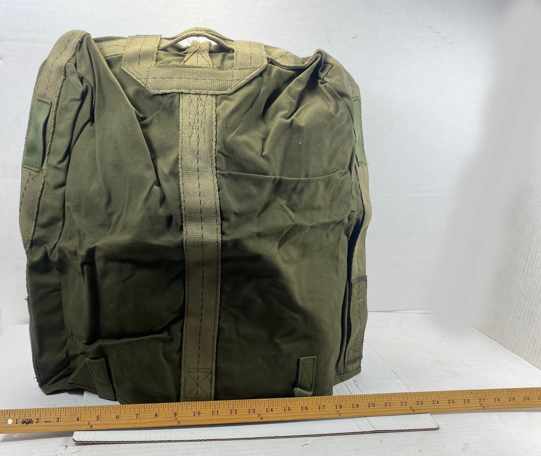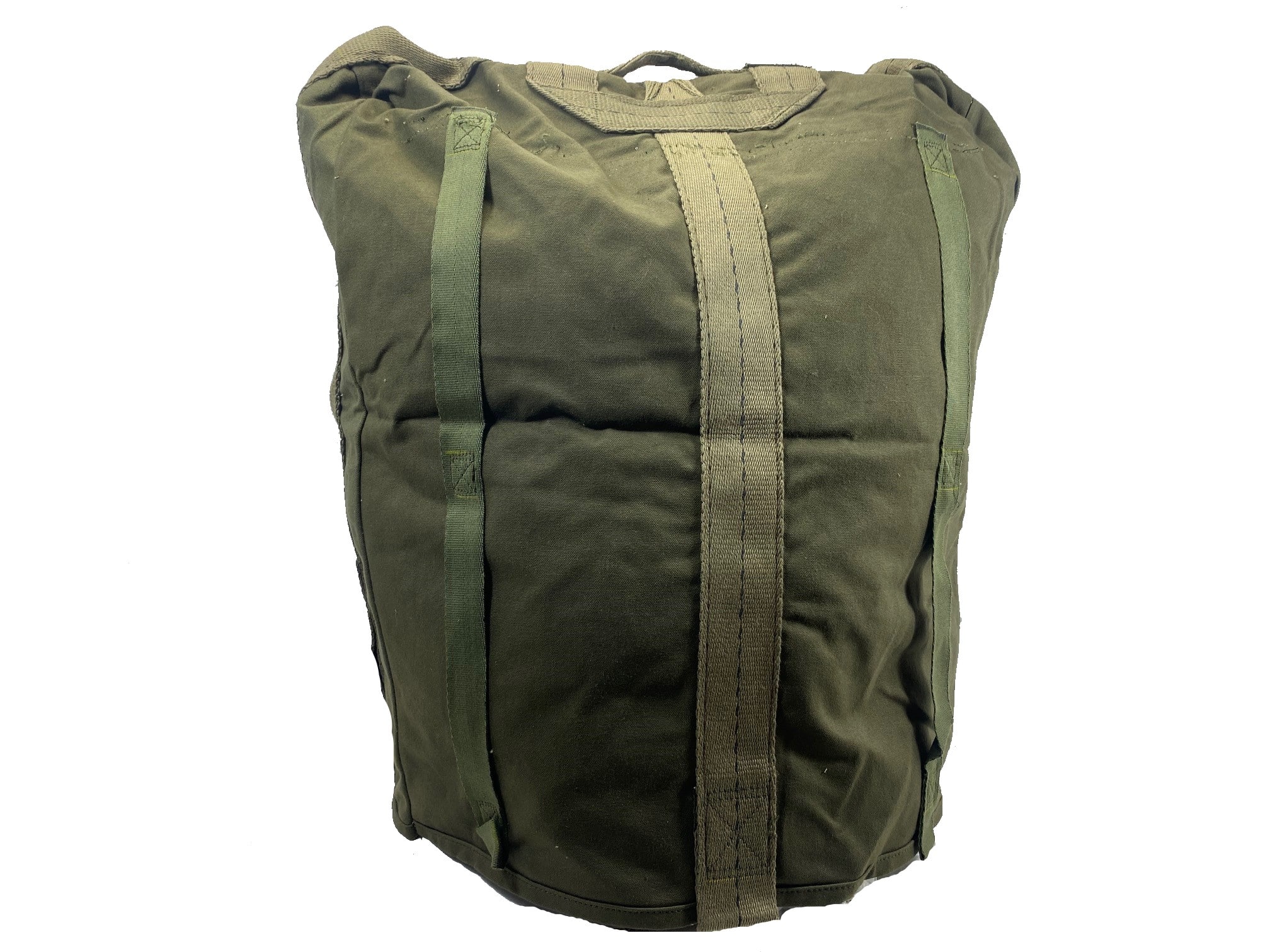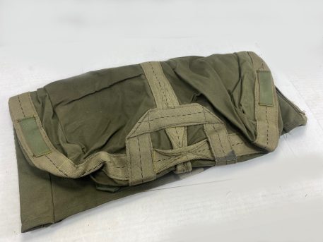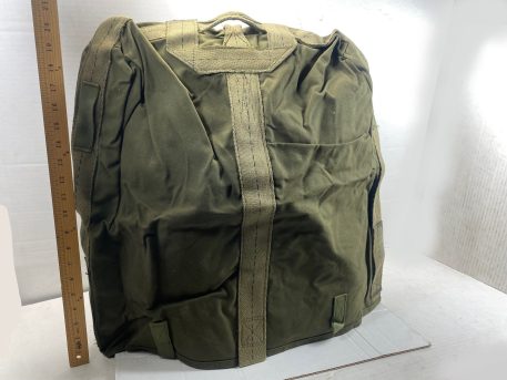 New old stock thick canvas top cover. We believe these were used to cover some type of aerial equipment from the canvas stitching resembling parachute kit bags. There are tabs on the bottom of cover to either tie down the cover, or it can be used to close it and use as a transport bag. Has a top handle to carry.