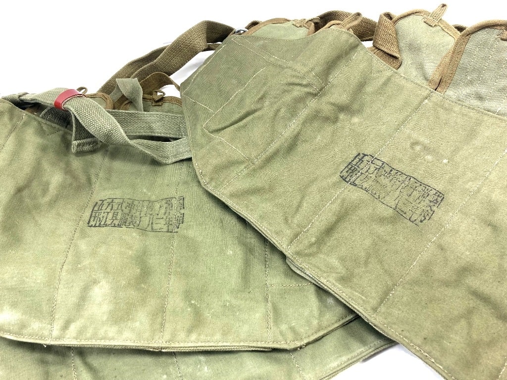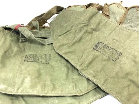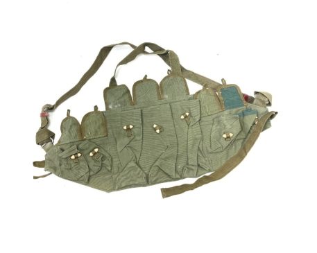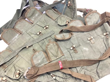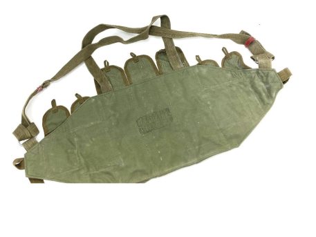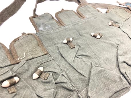 Ak-47 mag chest pouch chinese/vietnam. Chest rig cotton canvas with wood toggles. 7-pockets. Holds 3- 30rd AK47 Mags, 4 accessories. Some discoloration has begun to show from storage and age.
