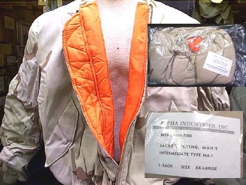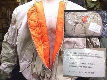 Desert 3 color MA-1 flight jacket made by Alpha Industries. 3 color desert pattern MA-1, reversible to orange flight jacket. MADE IN THE U.S. Original Surplus