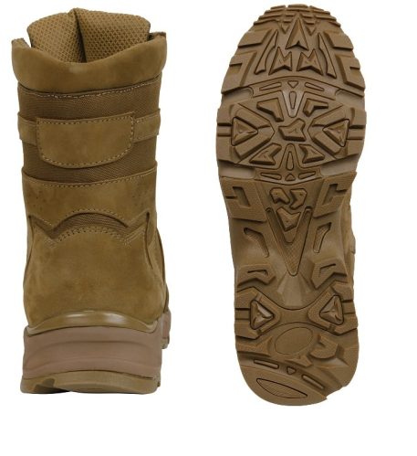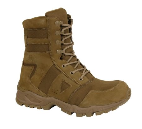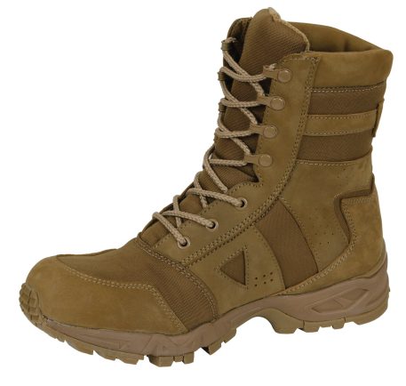 Coyote Brown Tactical Boots compliant to military regulation AR 670-1 standards. Height of 8″ (measured from the ground at back center), leather (nubuck) with nylon, a plain toe, a rubber outsole matching the upper in color, “cambrelle” synthetic lining (no mesh), and soles that measure 1.75″ in height (measured from the bottom of the outsole) that don’t extend over the toe.