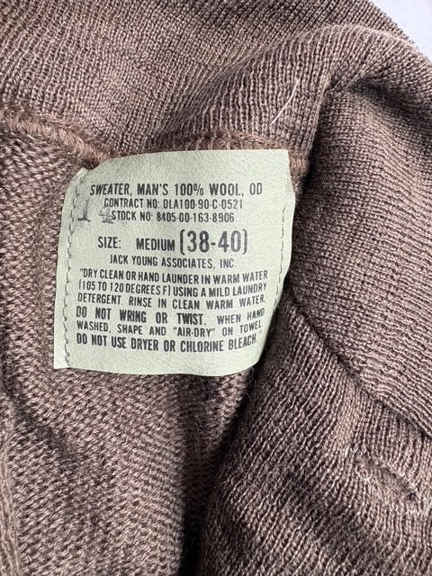 Worn under BDU’s for added warmth. The military has been using this particular design since WWII. New, original issue. Label says OD but color is actually brownish like WW2. Medium (38-40)