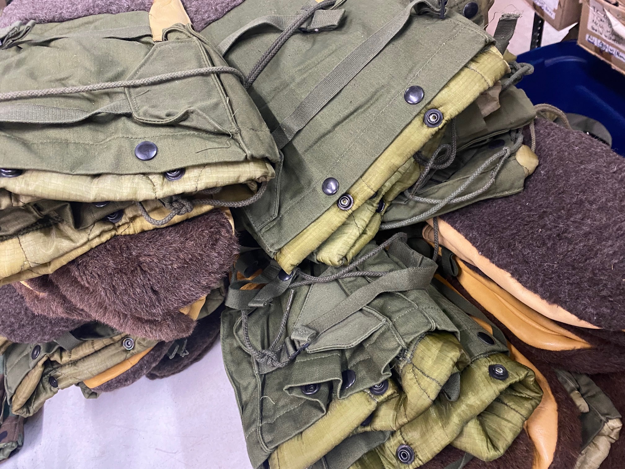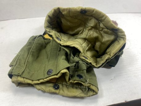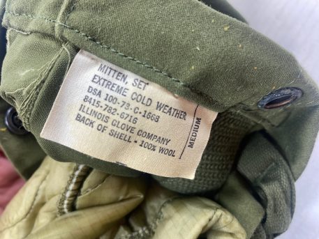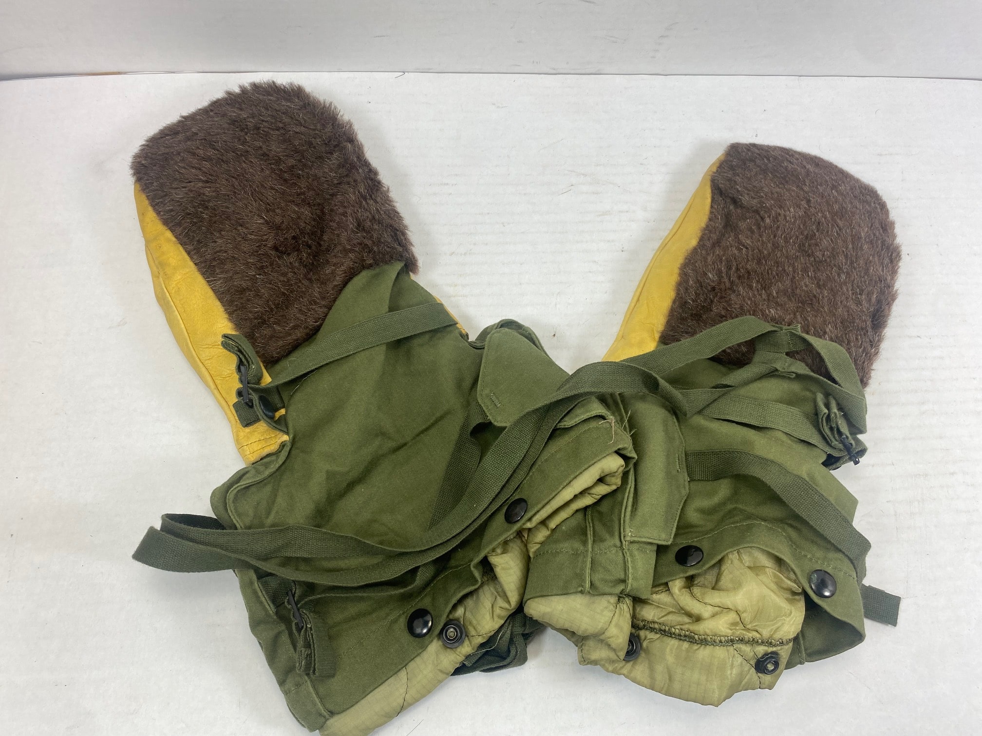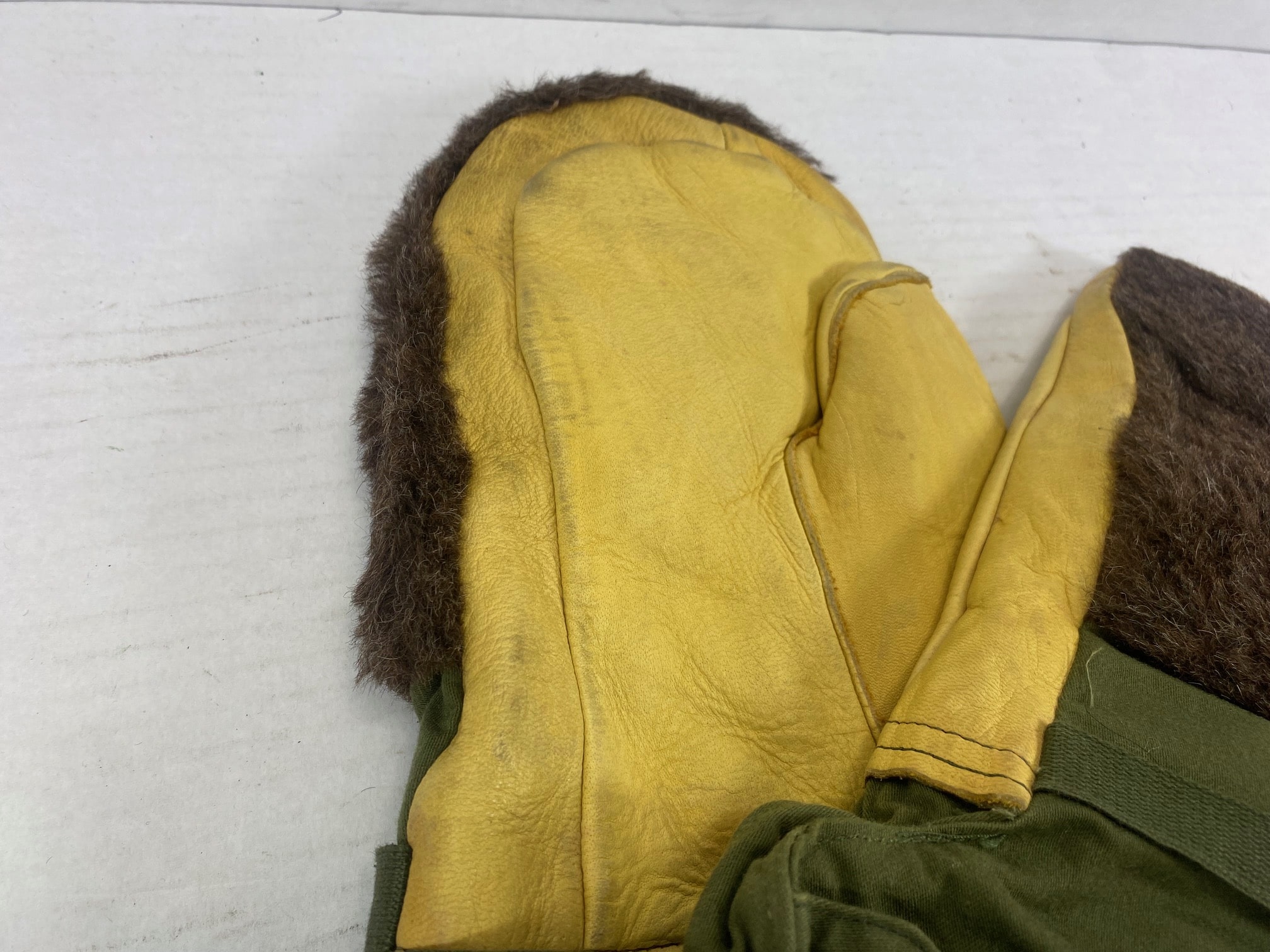 Arctic issue cold-weather mittens for US Army. Tough canvas and leather outers with fur back. Nylon holo-fil liners. Ultimate in cold-weather protection. Size: MEDIUM