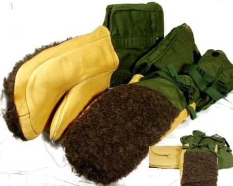 Arctic issue cold-weather mittens for US Army. Tough canvas and leather outers with fur back. nylon holofil liners. Ultimate in cold-weather protection. Size:Small