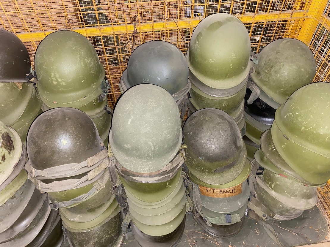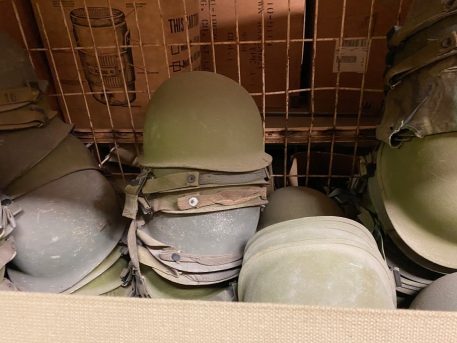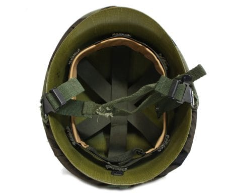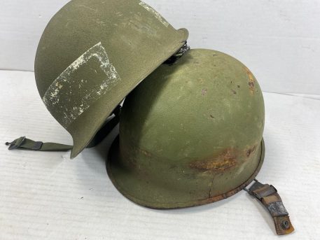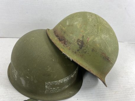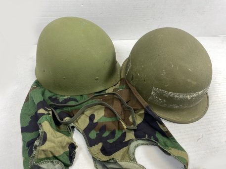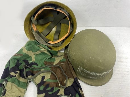 M-1 Army Helmet comes complete with steel pot, liner, chinstrap, camouflage cover, elastic band, and nape strap. All original U.S. M1 parts from 70’s and 80’s. These are in used good condition. Buy with confidence. Has the snap-in suspension system. *Available photos show condition of steel pots/liners and mixed components(helmet cover, nape, sweatband, chinstrap, cat eyes.) Used-good to like new, new old stock*