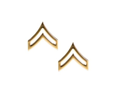 Brass, clutch-back collar ranks are sold by the pair, new original issue. Corporal. E-4.