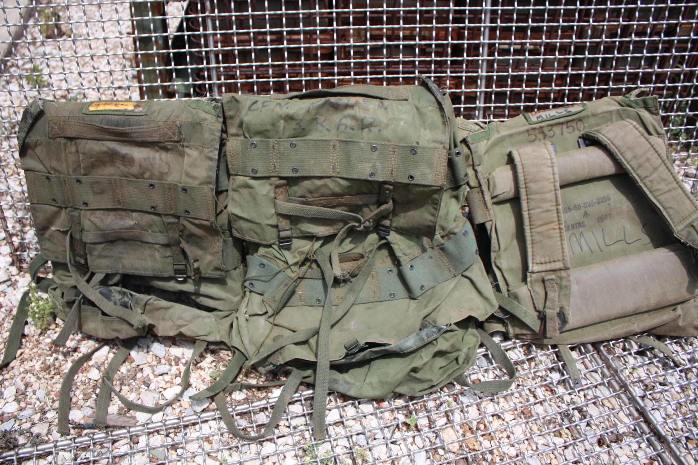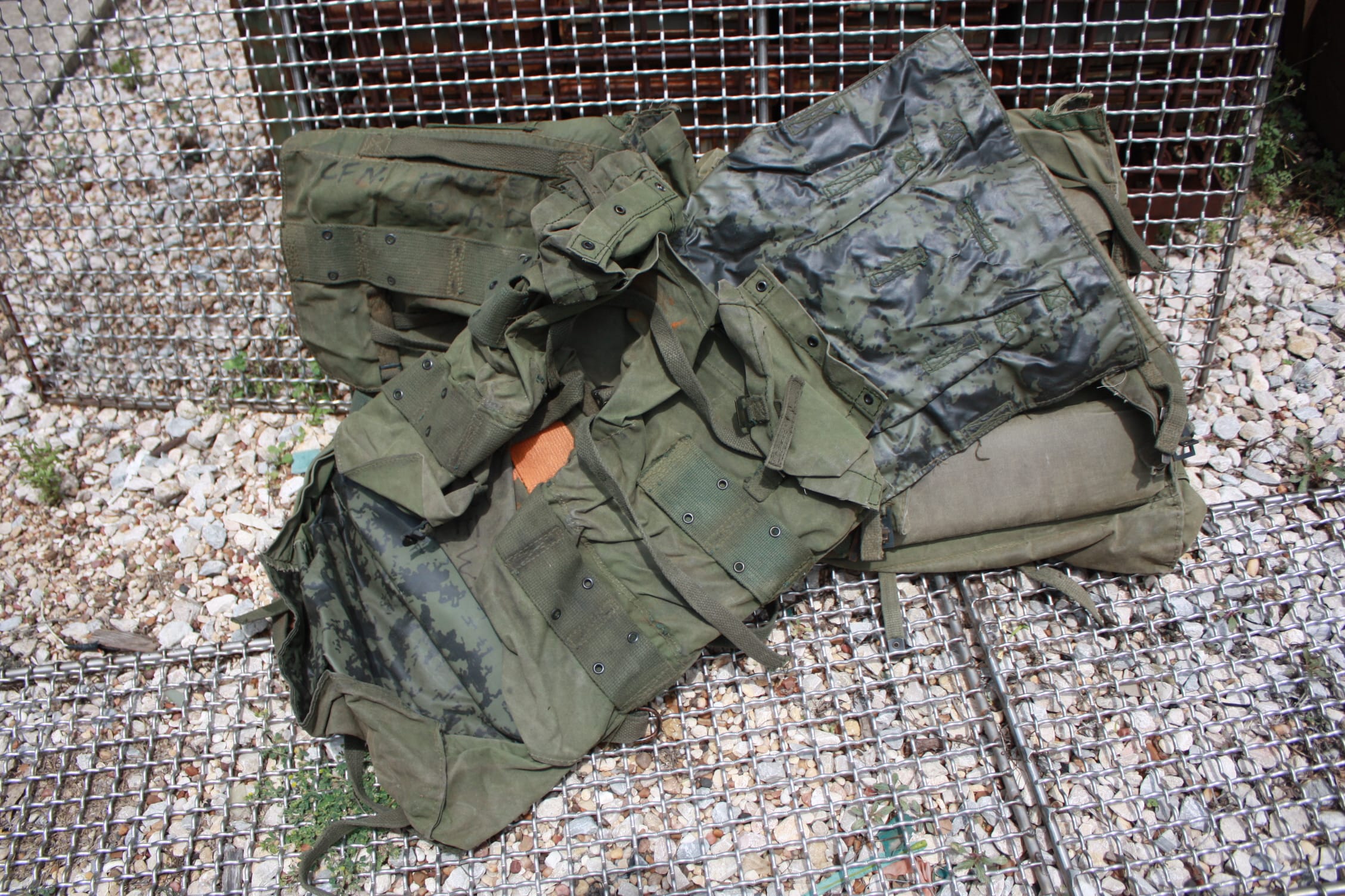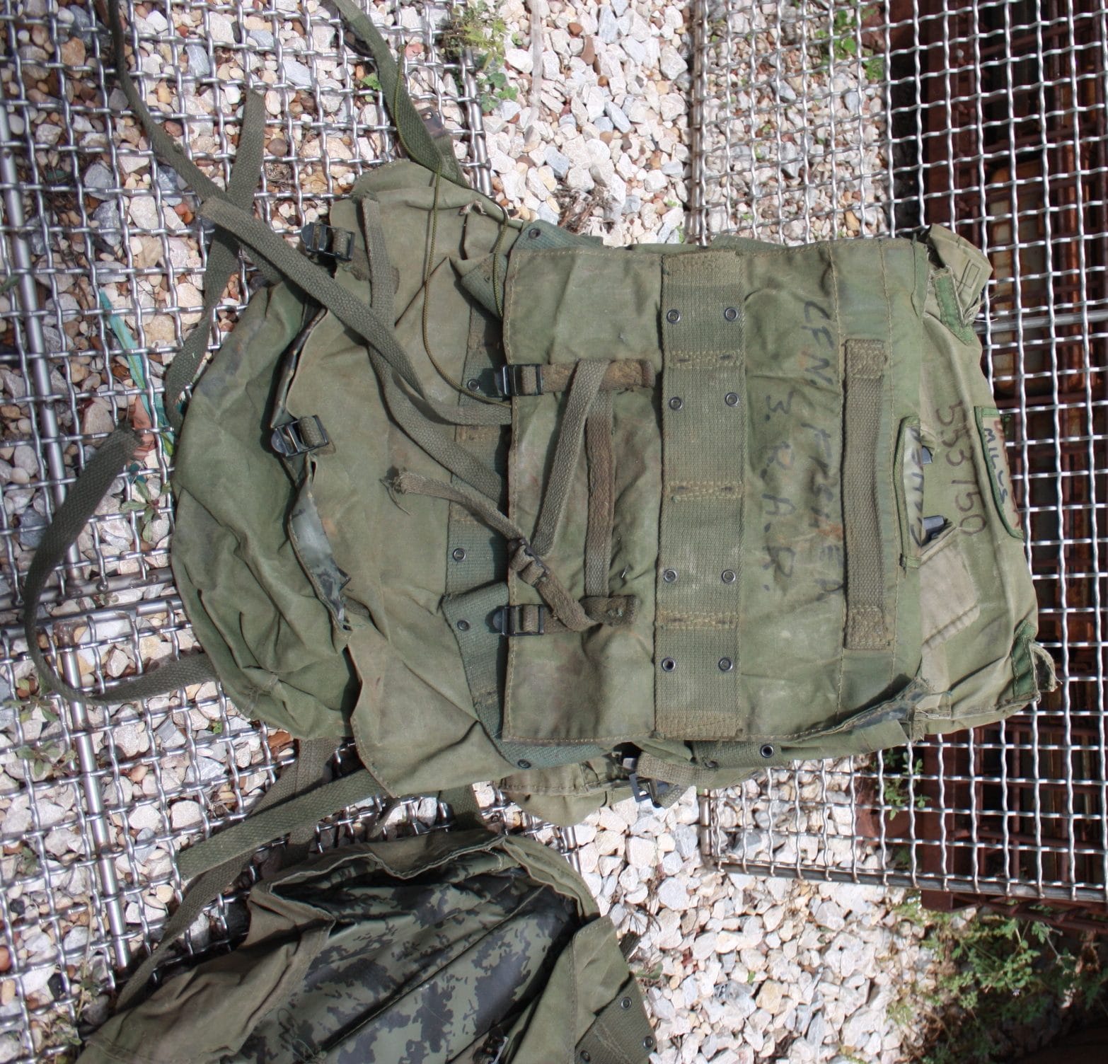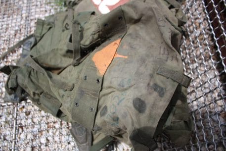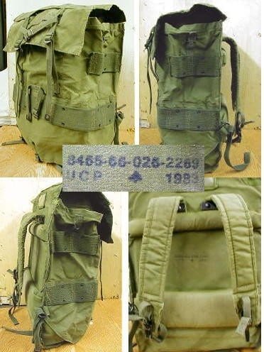 Used condition. Rough-missing pieces, stains, storage wear, writings, paint, you name it. Hard back frame with heavy padding. Waterproof canvas material. Plenty of equipment load straps. 2 main compartments and 2 smaller side pouches. 9″x 14″x 20″.