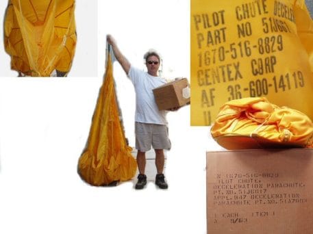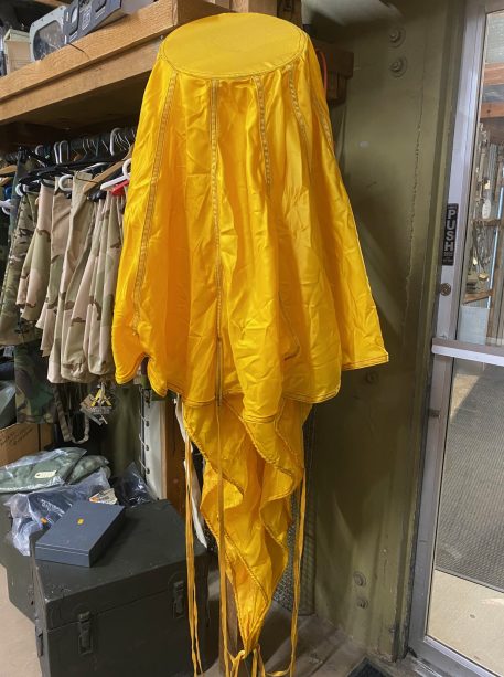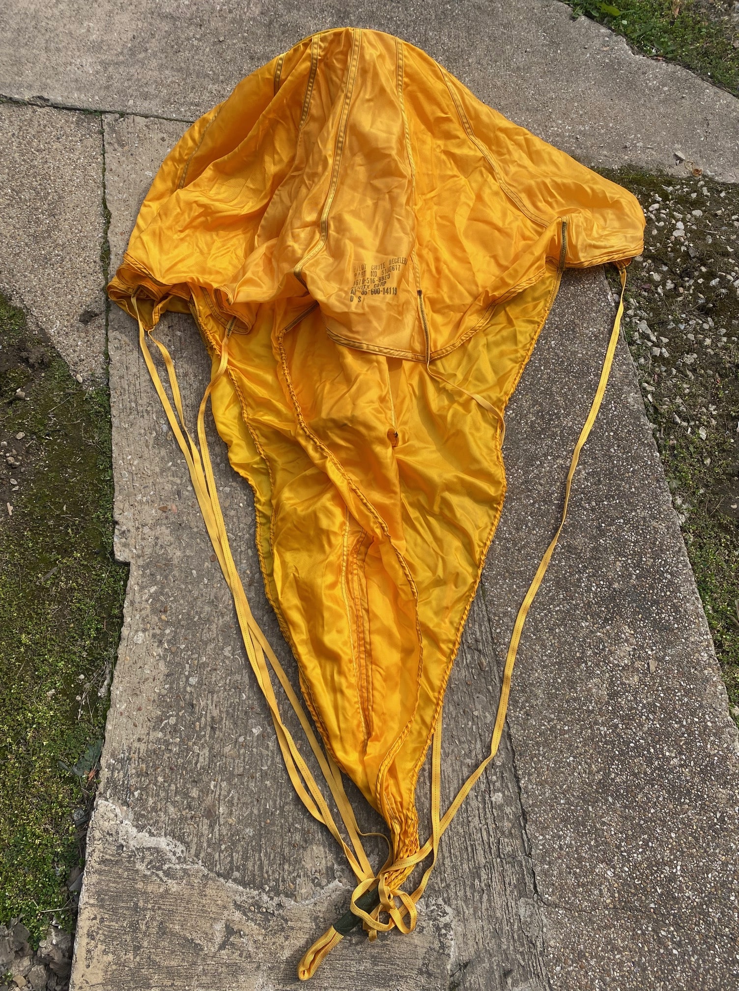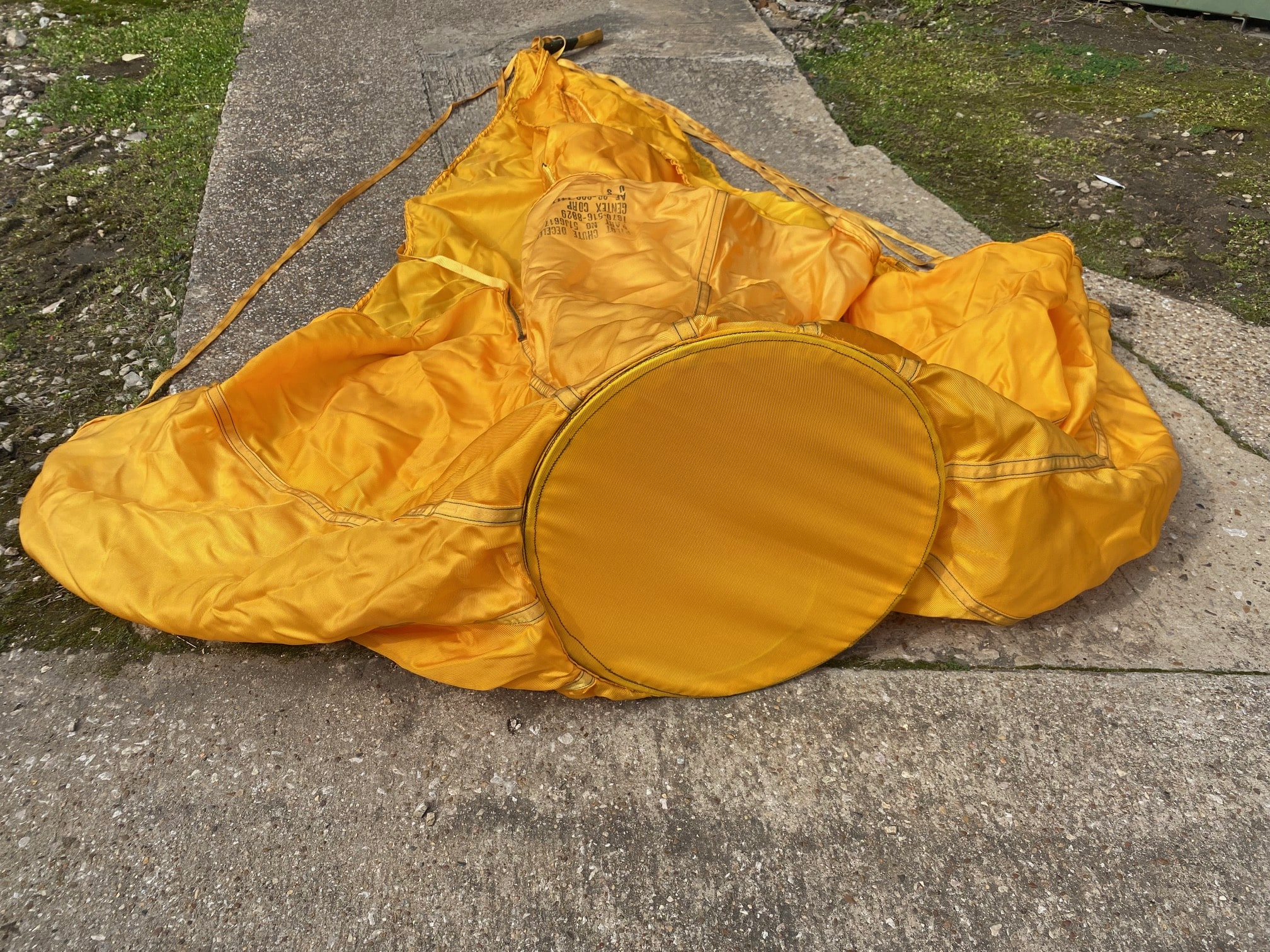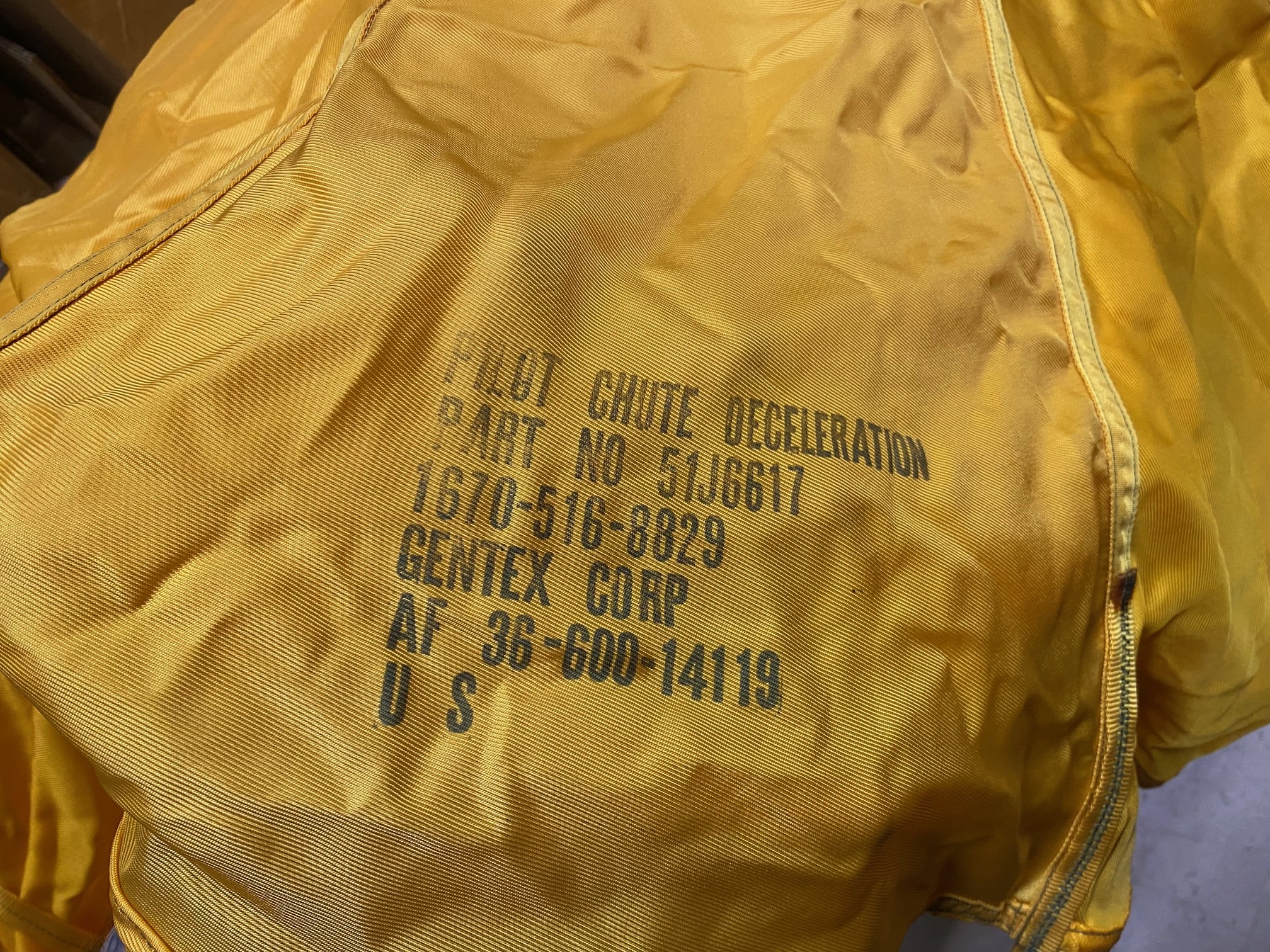 Spring-loaded pilot chute used to deploy an aircraft drag chute during landing and deceleration of B-47 aircraft. New in original government packaging. Measure approx. 7 ft long by 6 ft wide with 4 ft long spring in center…. Part. no. 51J6617