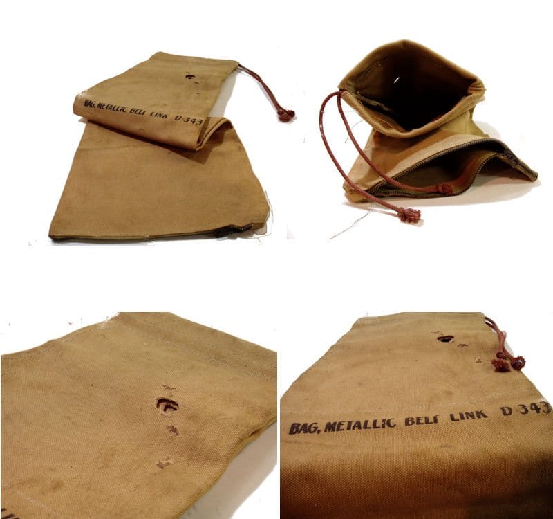 Belt Link Catch Bag for a machine Gun 50 caliber WW2 D34338. Khaki cotton catch bag for spent casings of soe sort military machine gun. Old used and abused sold as-is. The one you see in the picture is the one you get.