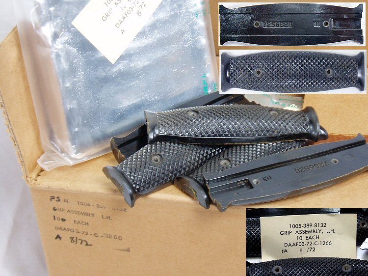 Vietnam Dated 1972, M-16 M-7 Bayonet grips. left- side of bayonet grip. Do not have the right side available. Also, these make great drawer handles if you don’t have a bayonet in need of repair. Black plastic. New and unissued . Sold individually (1 left side of handle only) or in the original 10 pack close out sale.