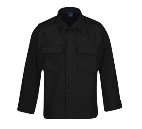 Made by “Propper”, a leading military contractor. 4 pockets, button-front, long-sleeve with padded elbows. Black BDUs shirt. Cotton ripstop or twill material.