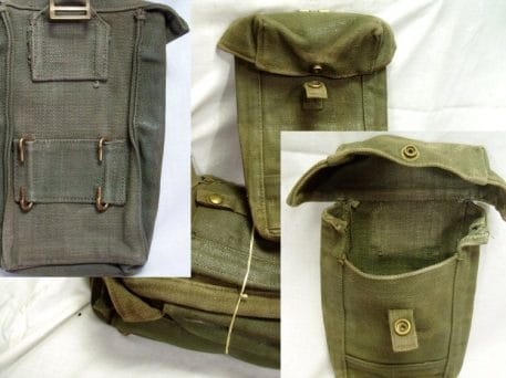 Old canvas military ammo pouch from the European post war forces. Used in good condition. Various colors ranging from grey to green. Various fastener devices.