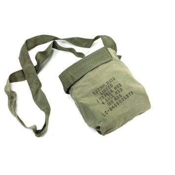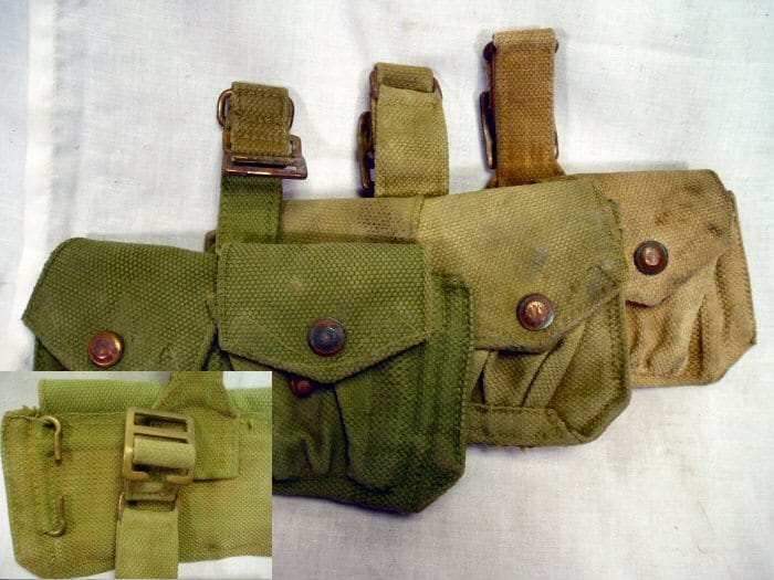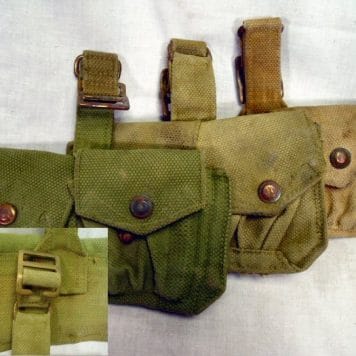 Canvas small arms ammo pouch for Belgian army ammunition. 2 pocket olive drab cotton. Shades and colors will vary. Used and in good condition. Pockets are about the same size as M-1 Garand. 1″x2″x3″