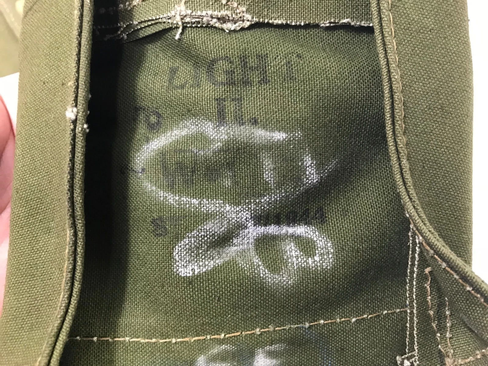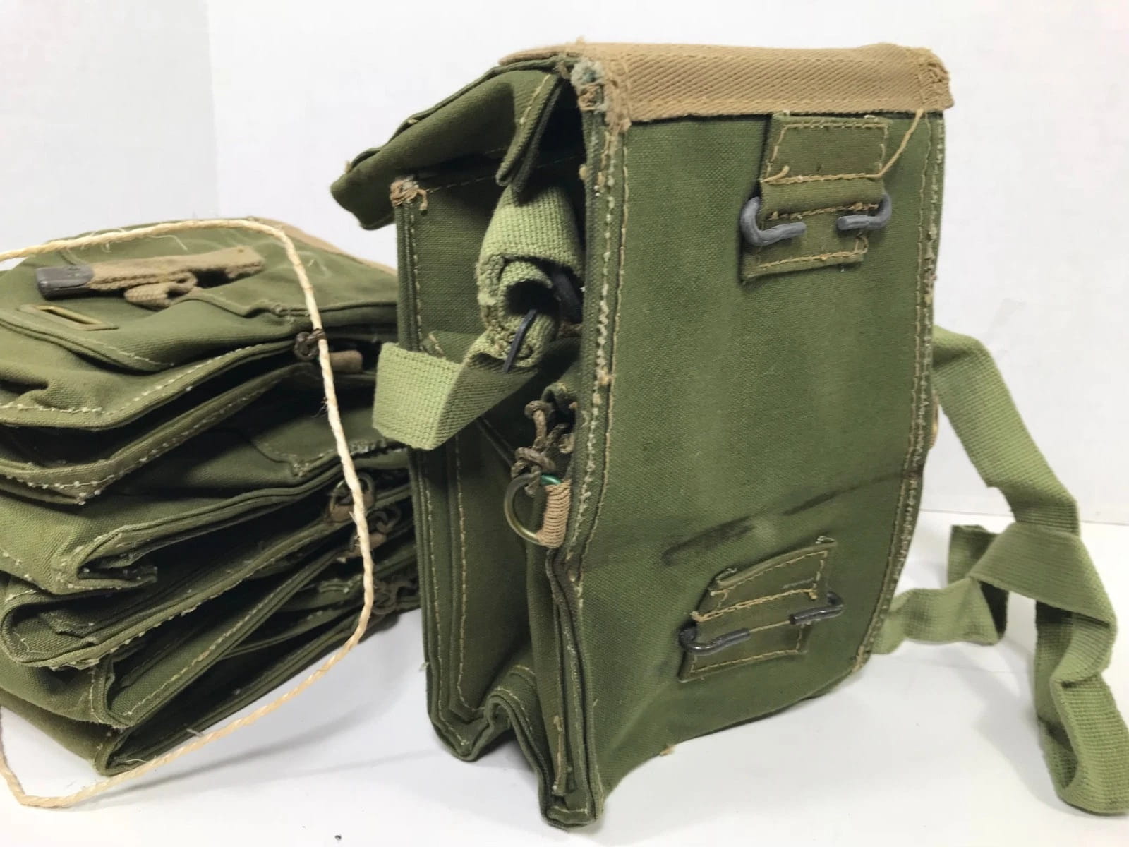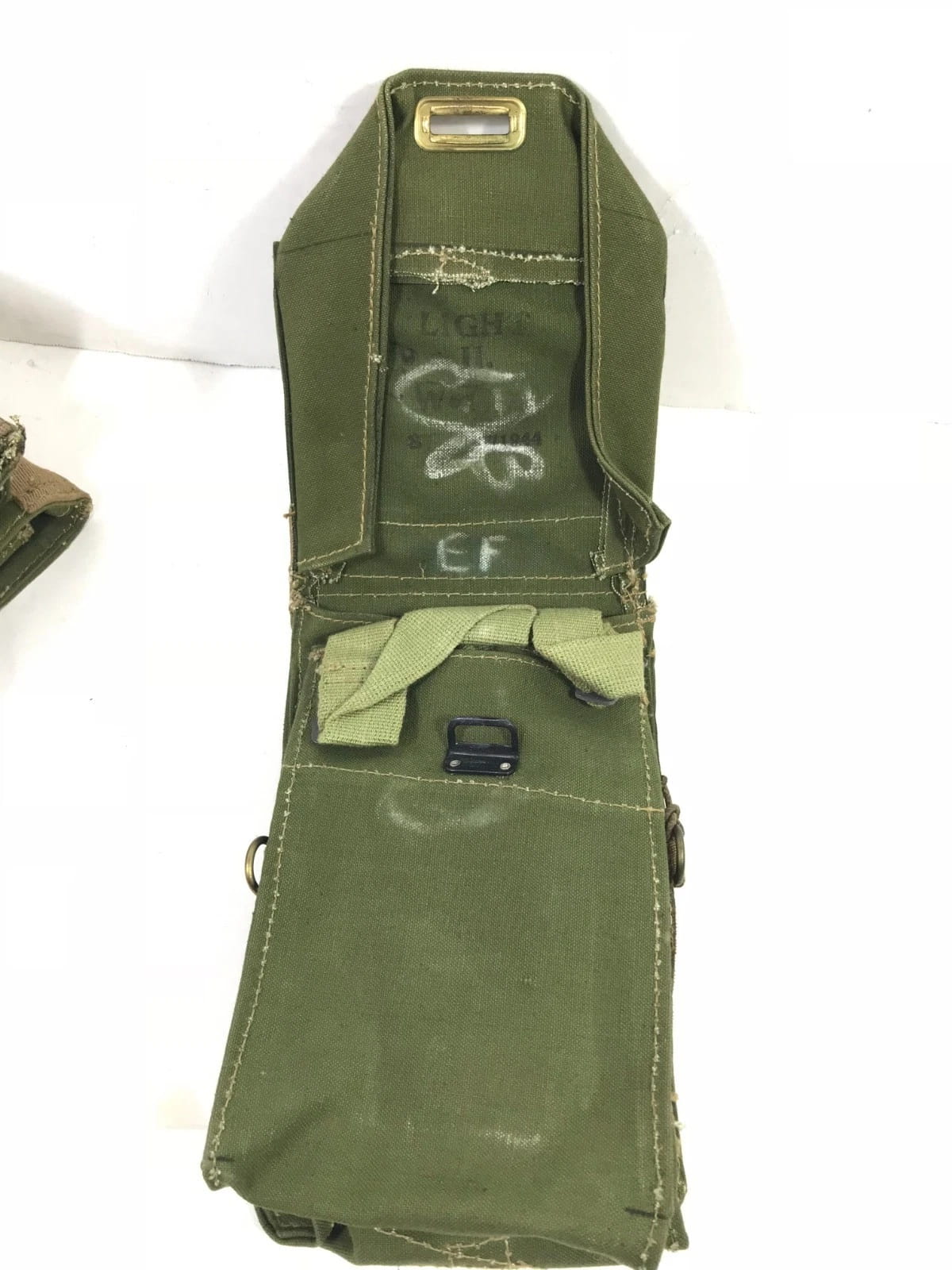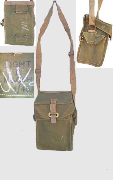 Notice the original maker’s chalk markings on the material. Outstanding quality and character, make this piece an excellent purchase. Measures 4″ x 3″ x 8″, with adjustable shoulder strap and belt carrying attachments.