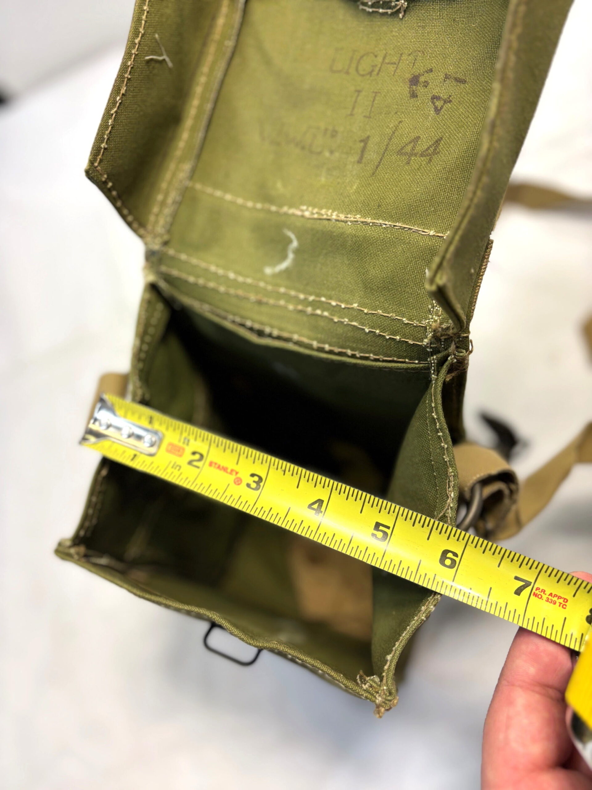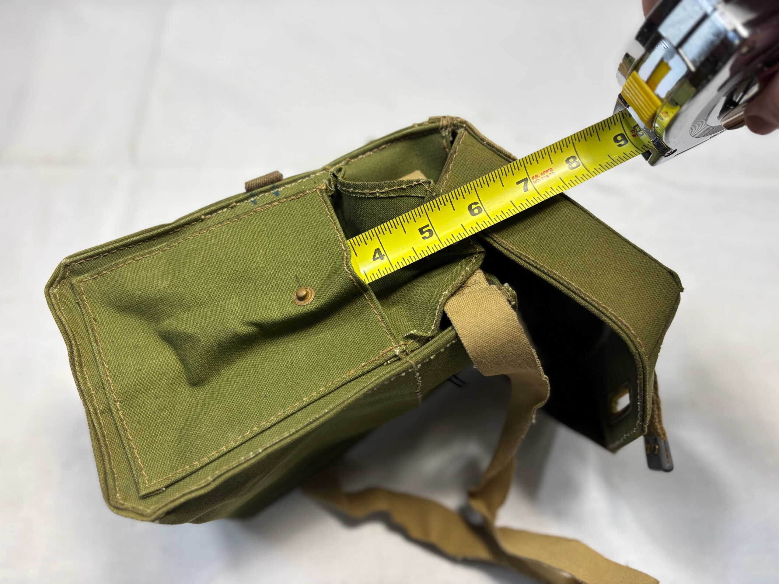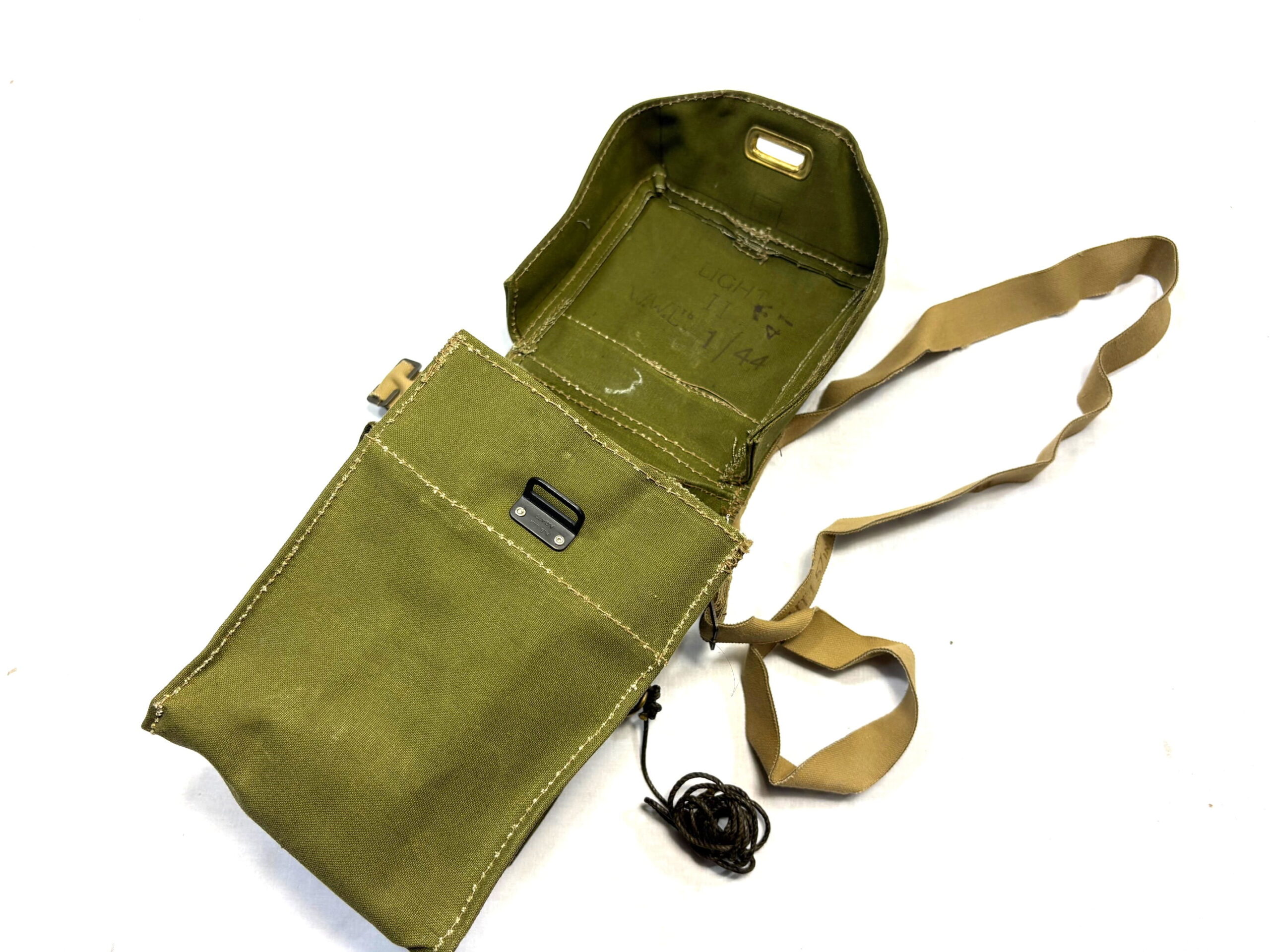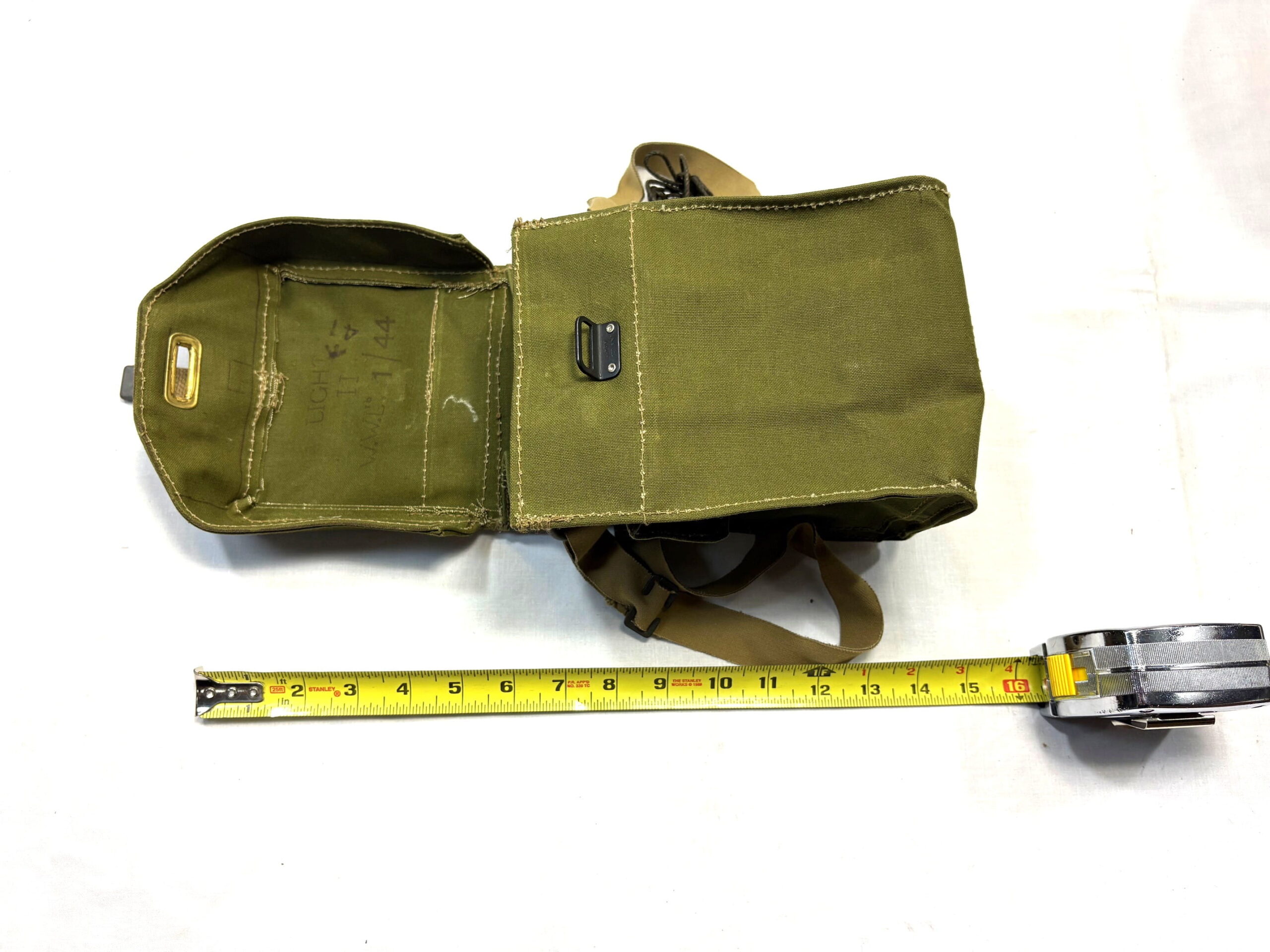 British Light 2 pouch Made in England during WW2. New old stock. WW2 stamps are legible. Most dated 1944. Measures approx 8″ x 4″ x 3″, with adjustable shoulder strap and belt carrying attachments/hooks (for M1944 web gear) Inner and side pockets small shoulder bag great for ammo, cameras, and accessories. Durable canvas will last for many years.
