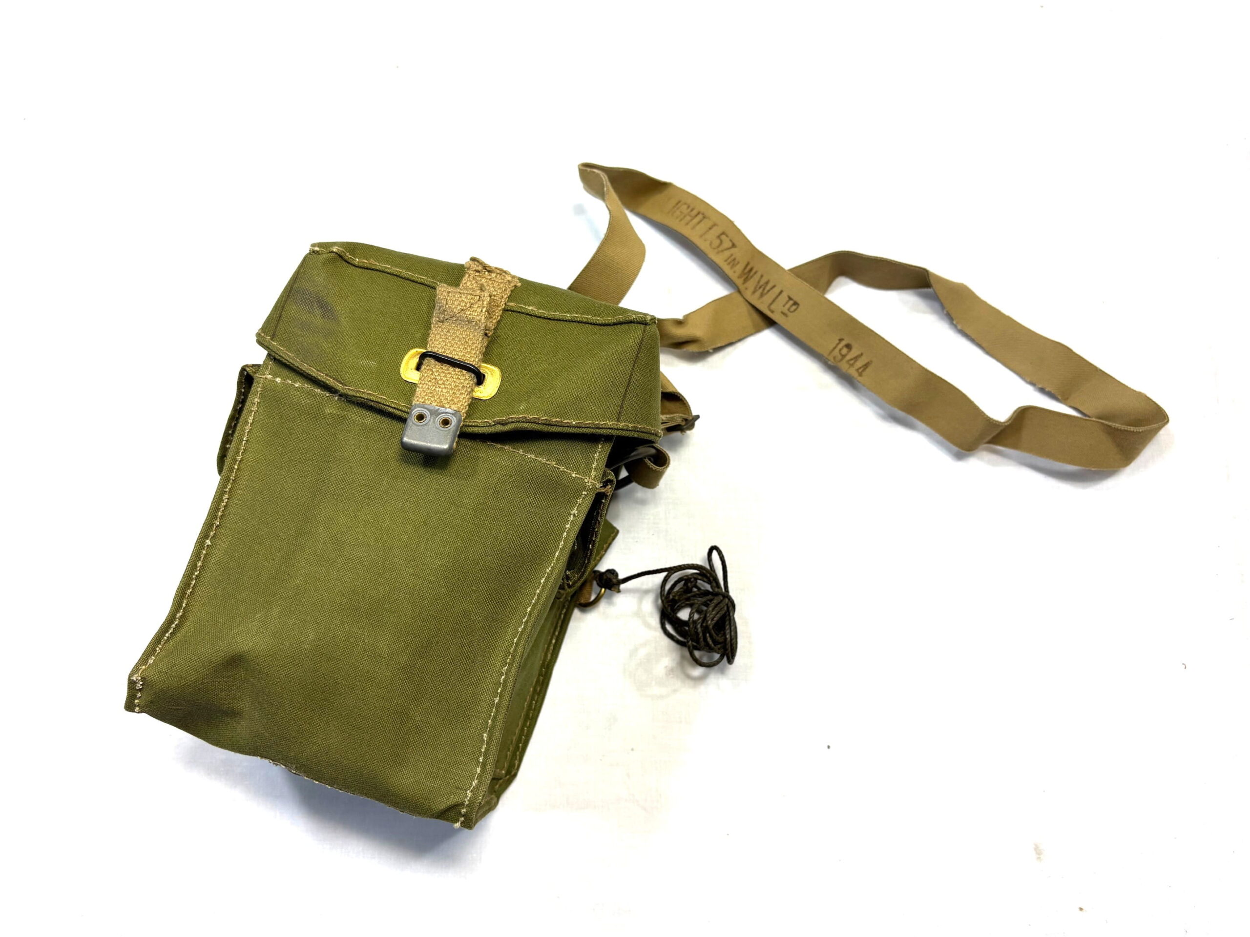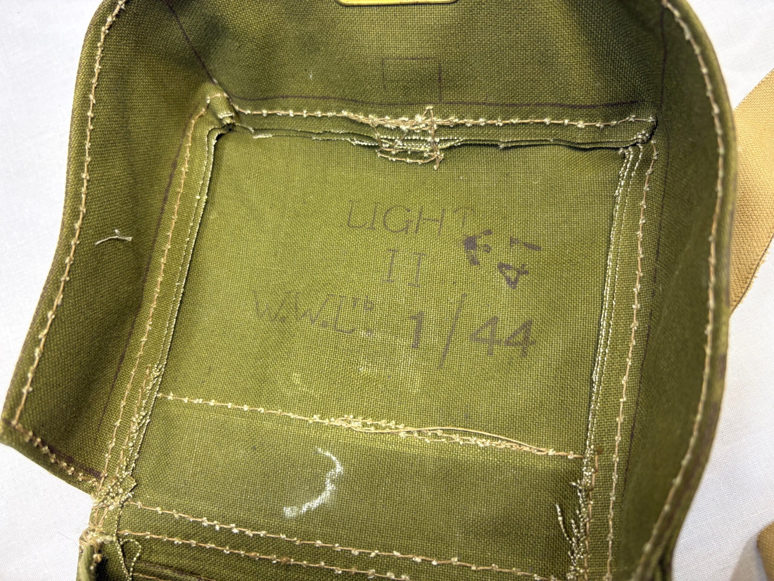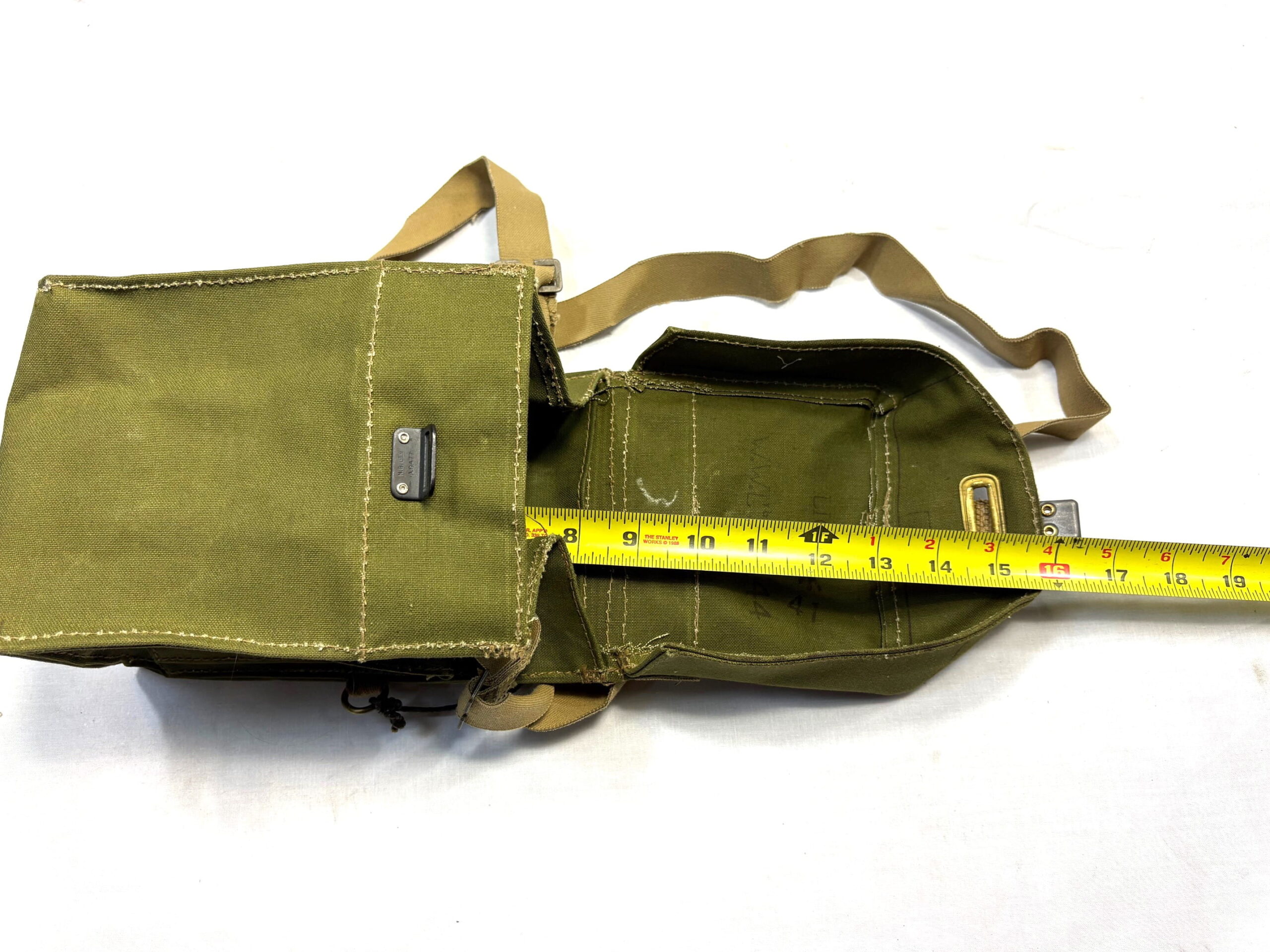 British Light 2 pouch Made in England during WW2. New old stock. WW2 stamps are legible. Most dated 1944. Measures approx 8″ x 4″ x 3″, with adjustable shoulder strap and belt carrying attachments/hooks (for M1944 web gear) Inner and side pockets small shoulder bag great for ammo, cameras, and accessories. Durable canvas will last for many years.
