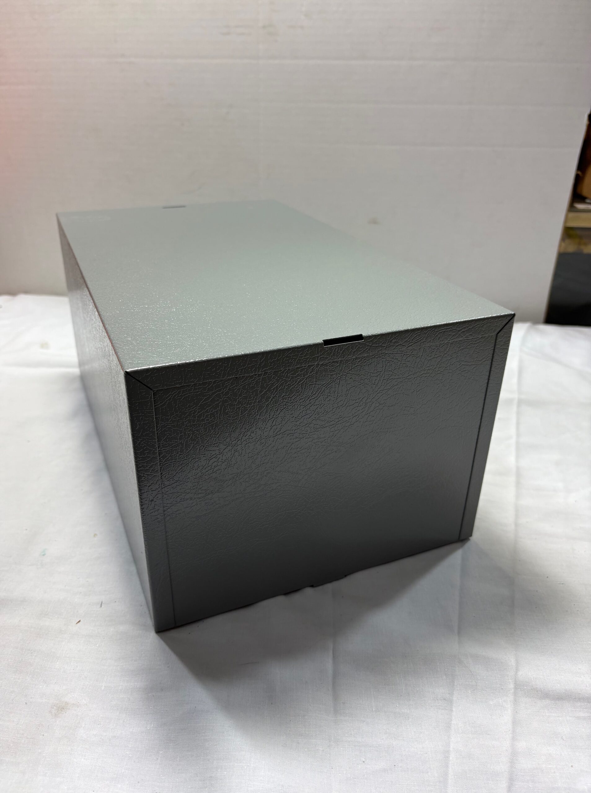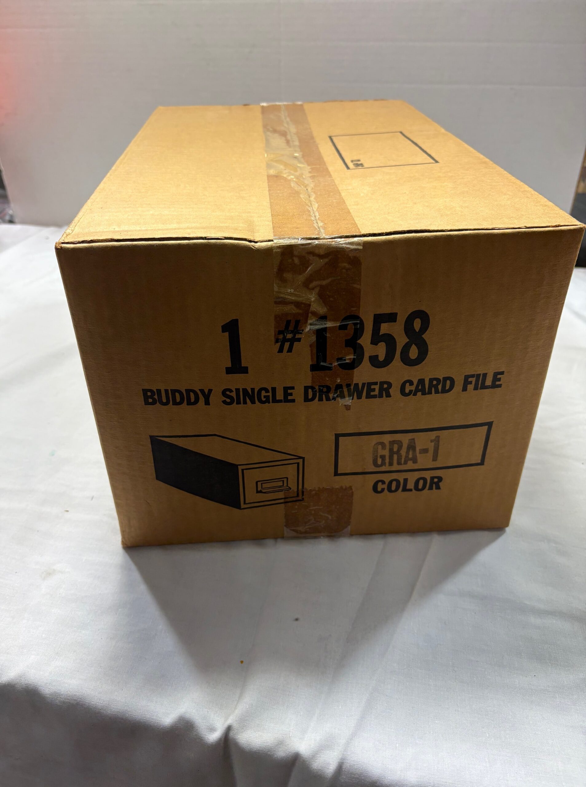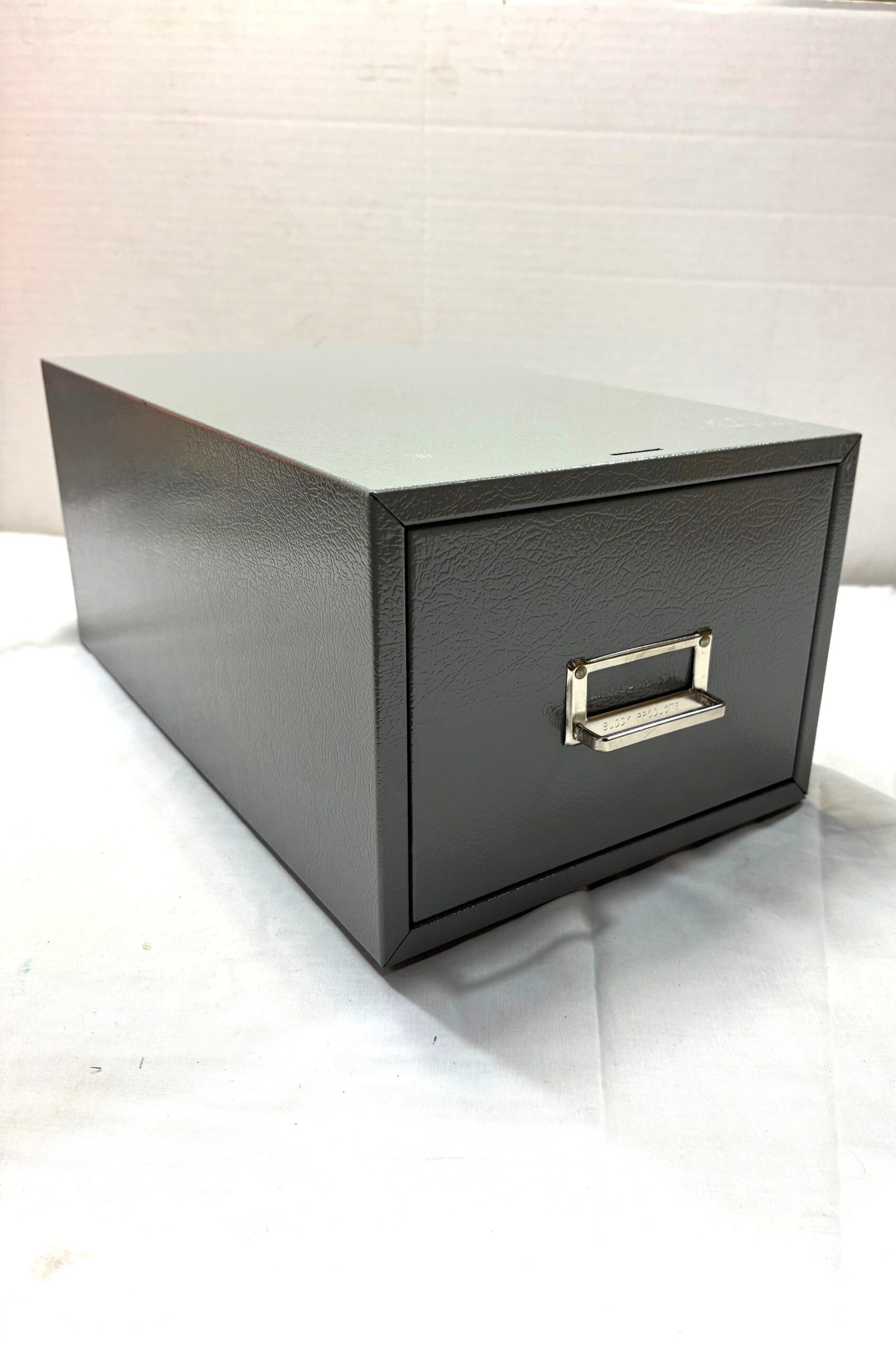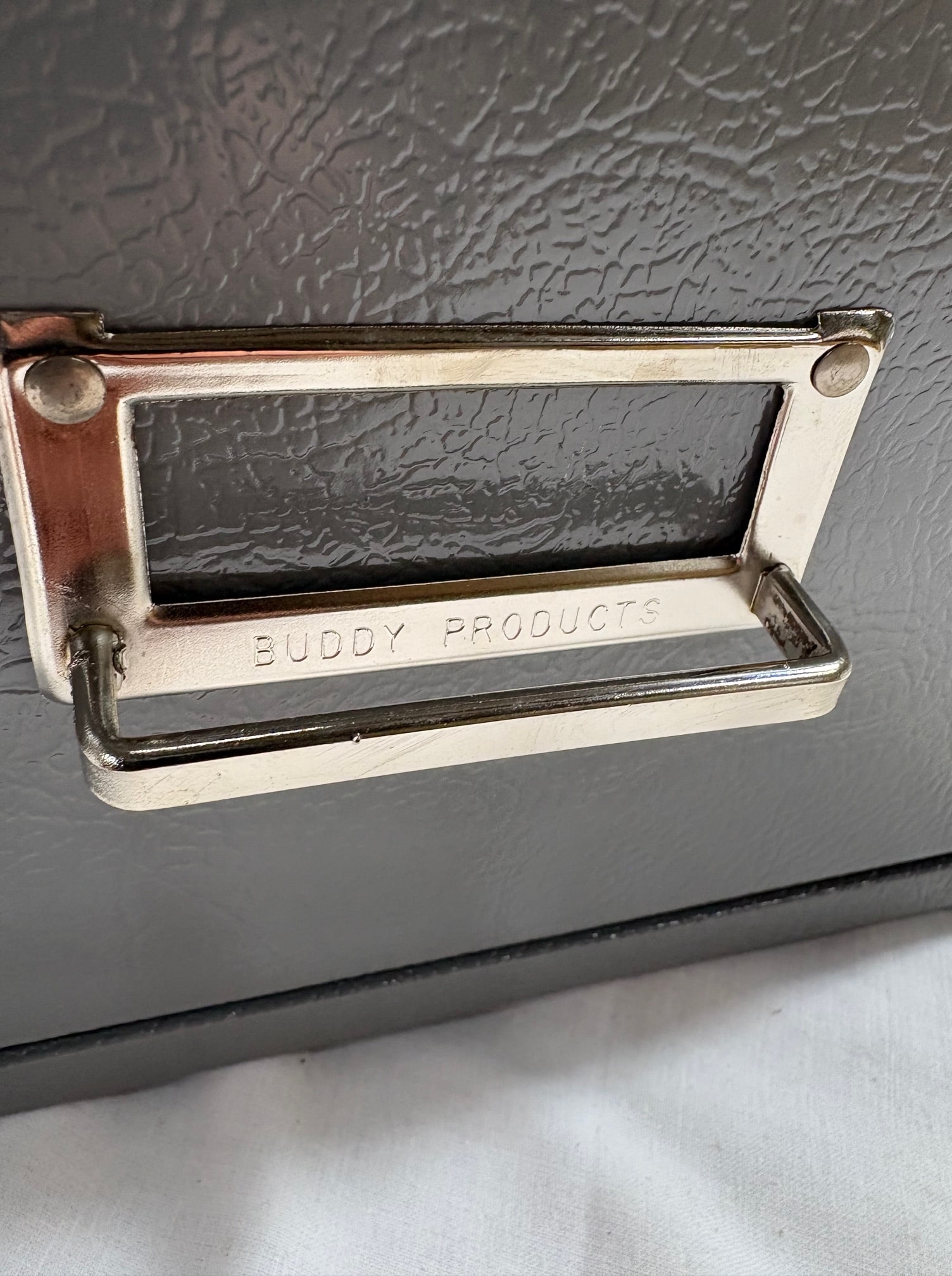 Metal file drawer made by Buddy. Similar to STEEL MASTER. New old stock government surplus. Single drawer file that is perfect for storage. These file drawers interlock and can be stacked securely. Overall dimensions are 9 5/8″ wide x 7 1/4″ tall and 16 1/4″ long. Weighs 9 lbs. Grey color.