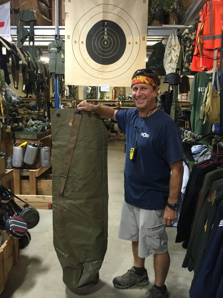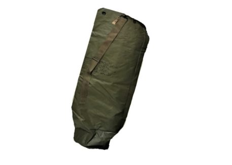 Features carry strap and fold-over eye and hook closure system just like the military duffle.