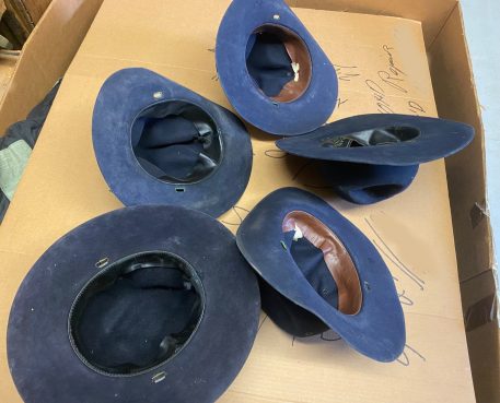 Smokey Bear campaign hat for drill sergeants. Used rough dirty condition, can be cleaned up with a brush. This item is for 5 blue campaign hats. ALL HATS ARE X-SMALL SIZES 6 1/4- 6 3/4.