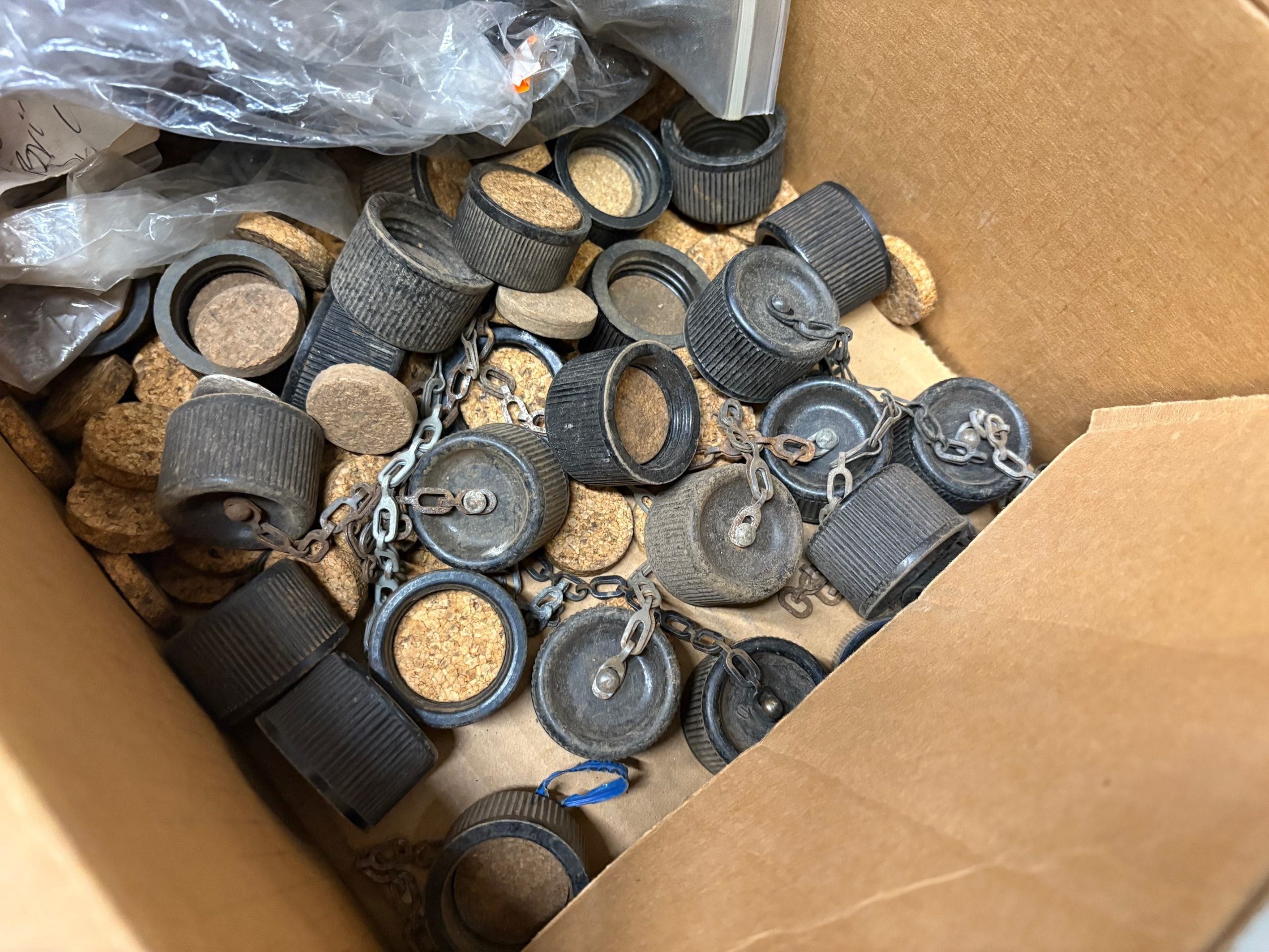 Plastic cap, chain, and cork for World War 2 aluminum and stainless 1 quart steel metal drinking canteens. Used and in fair condition. CANTEEN NOT INCLUDED. Does not include circular attachment ring on end.