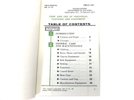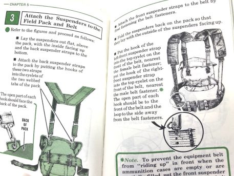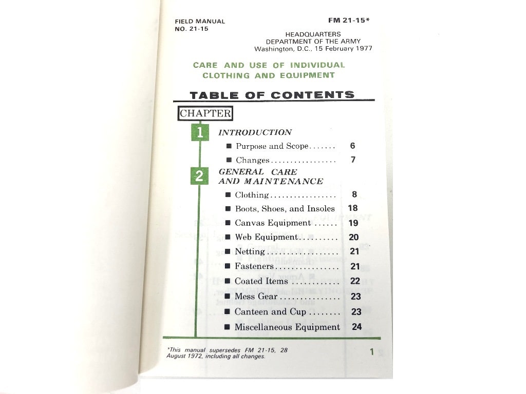 1977 dated army field manual. This manual supersedes FM21-15 printed in 1972. Valuable information on the general use and maintenance of clothing, boots, shoes, canvas equipment, web equipment, netting, fasteners, coated items, mess gear, canteens, clothing for all climates, Bivouac equipment, load-carrying equipment, existence loads, fighting loads, pack boards, grenade vests, ALICE gear, and other basic equipment issued to the 1970’s soldier. Also includes sections on proper placement of insignia and identification marking. 217 pages, 4″ x 6″. New original surplus.