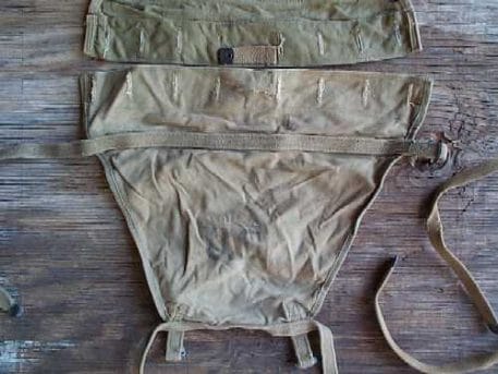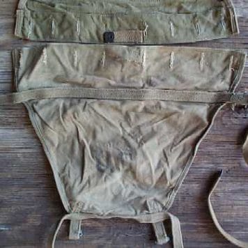 Many collectors call this the tailpiece for the M-1928 pack. It is used to increase the carry capacity of the Haversack. It attaches by means of a leather strap which inserts through the button slots on the pack and tailpiece. Used-fair condition