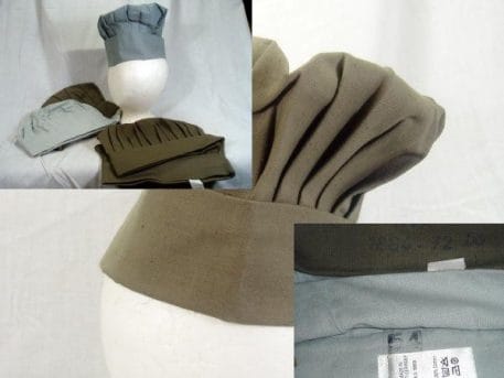 New, East German Cold-War Surplus. These 100% cotton chef’s hats, come in a variety of colors (most are grey or light blue). Great for cooks and or cooking.