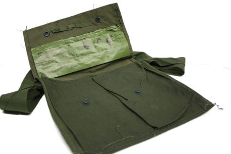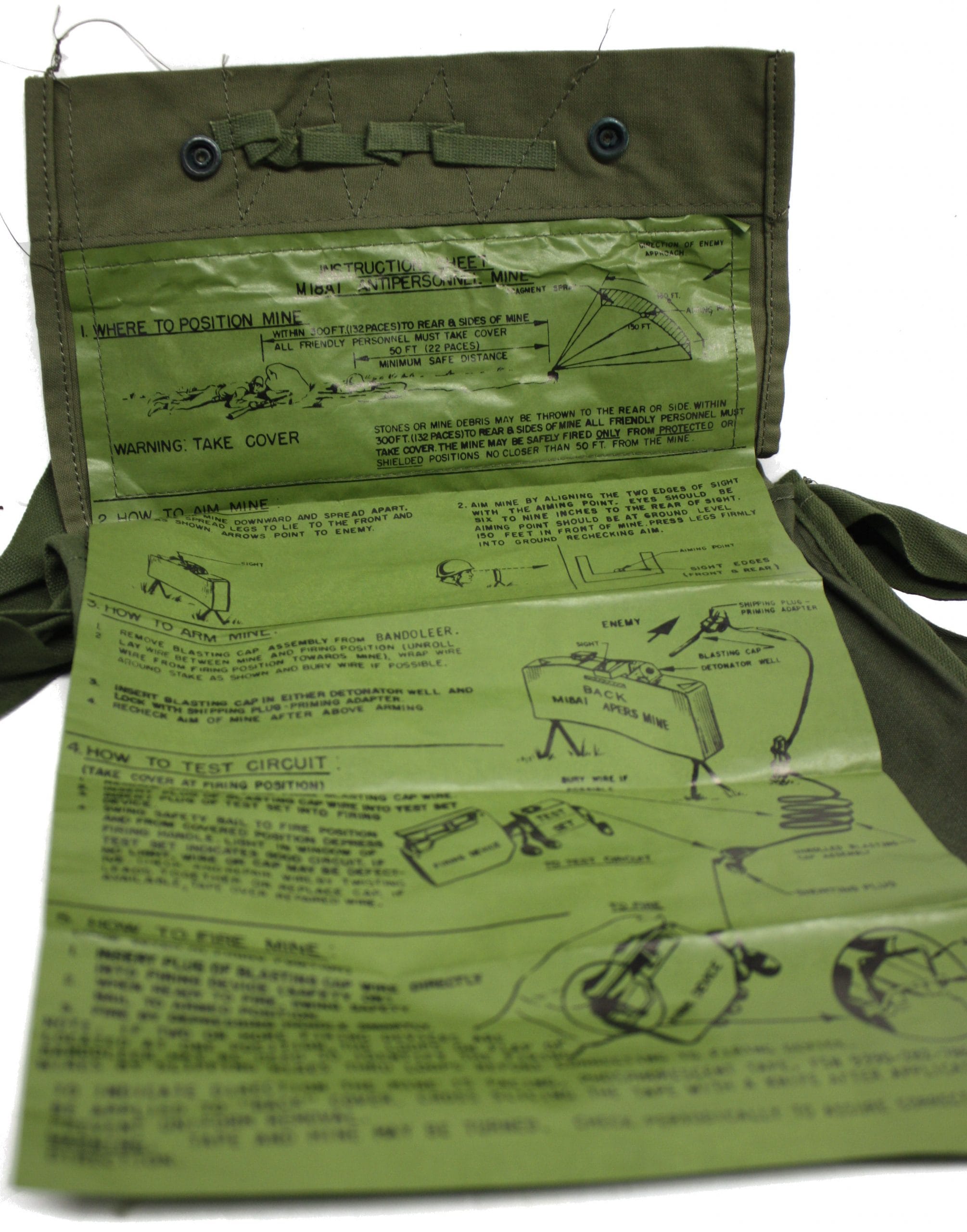 CLAYMORE MINE BAG. M18A1 Antipersonnel Mine Carrier. Makes a great lightweight 2-pocket shoulder bag for mags, shells, samples, or tools. Green cotton canvas. 12” x 12” when closed. Great for Vietnam collectors and reenactors.