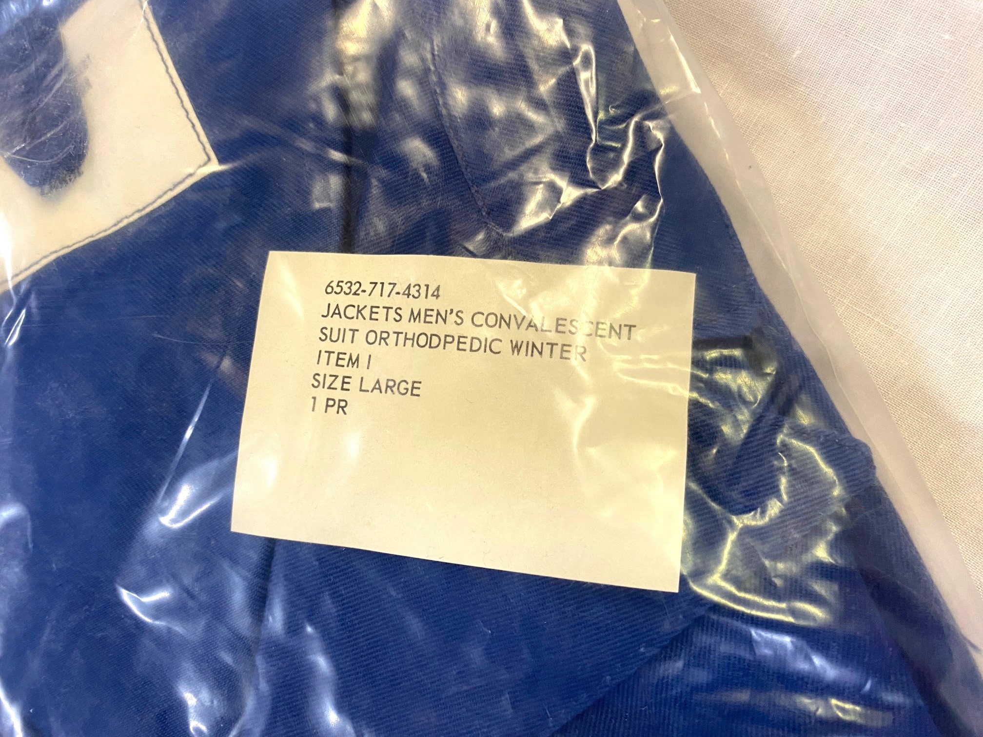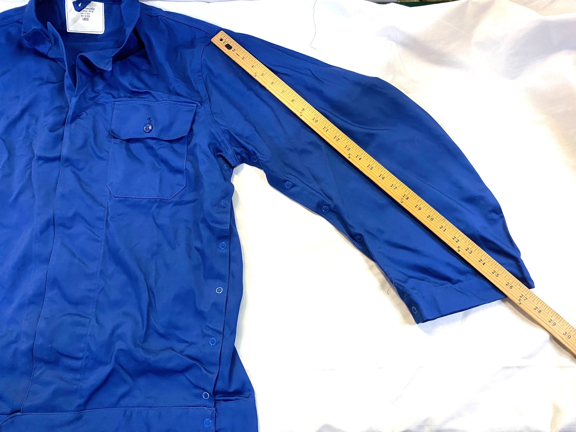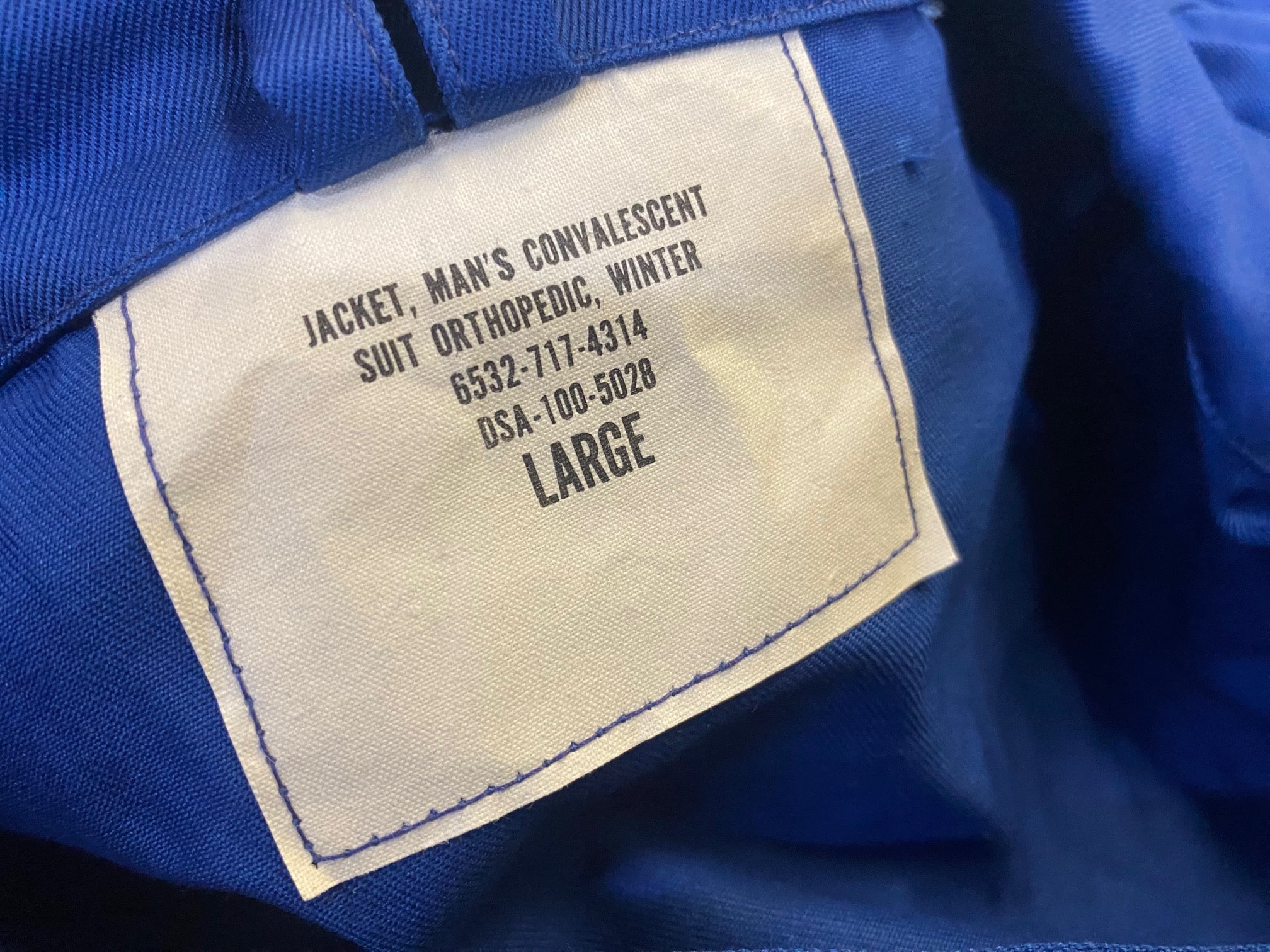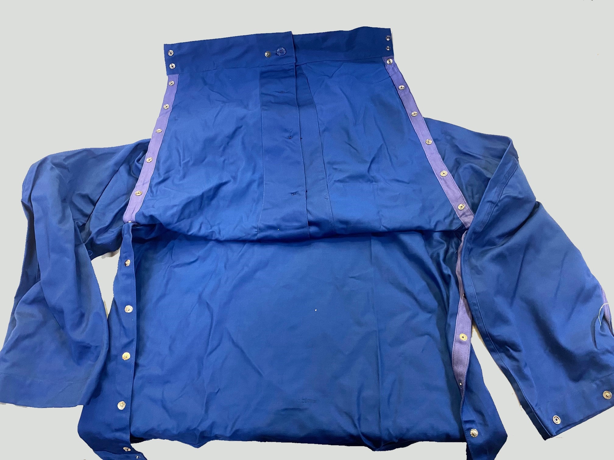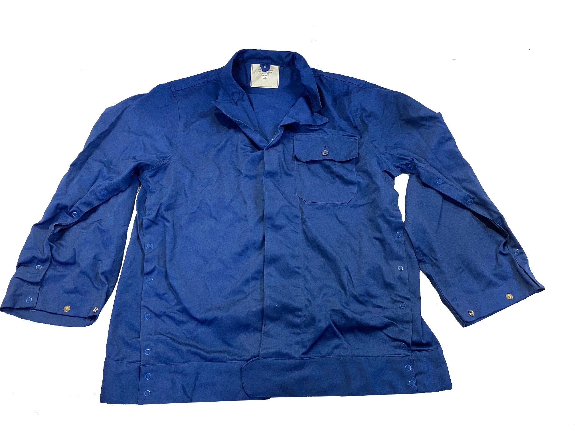 All cotton Blue US military hospital shirt. Snaps all around for easy on-off. New old stock. Not dated, but believed to be Vietnam era because of DSA number. SIZE LARGE ONLY.